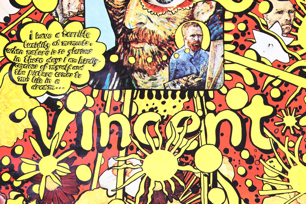 Poster by Martin Sharp, depicting Vincent Van Gogh surrounded by a vibrant psychedelic yellow and orange design, this poster looks to be a 70's reprint without printer and publisher details or later yellow border, measuring 73.5cm x 49cm.