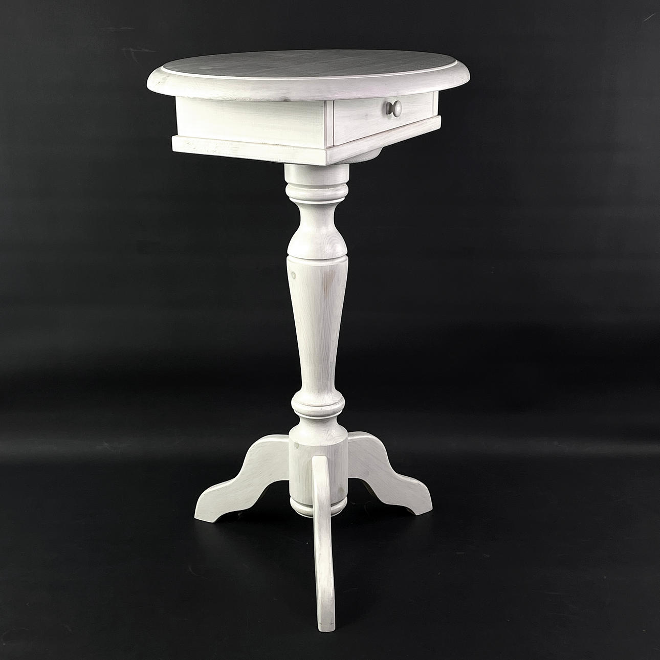 Oval pillar table with drawer that can be pushed in both directions, light stained.