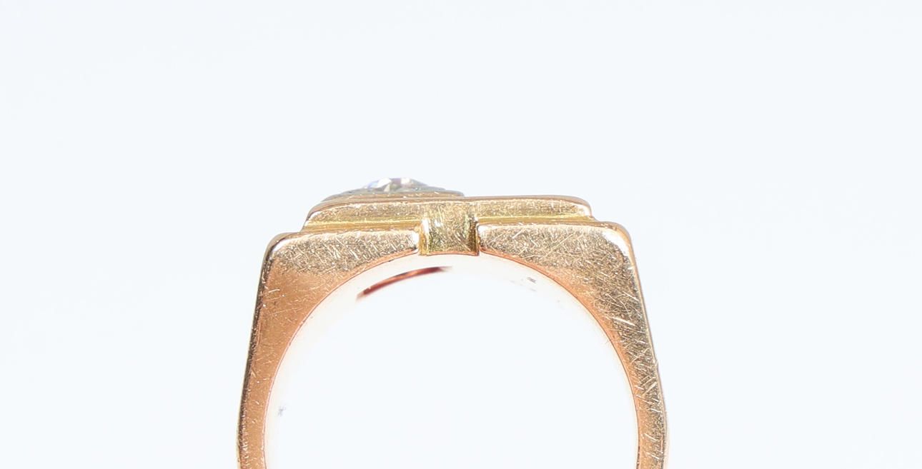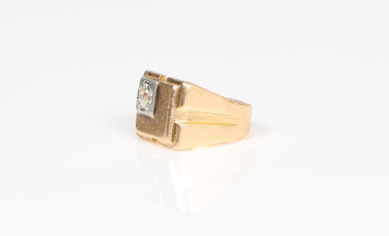 The rectangular head set with a single diamond measuring 0.25 carat approximately, ring size K, 16.5g.