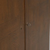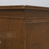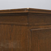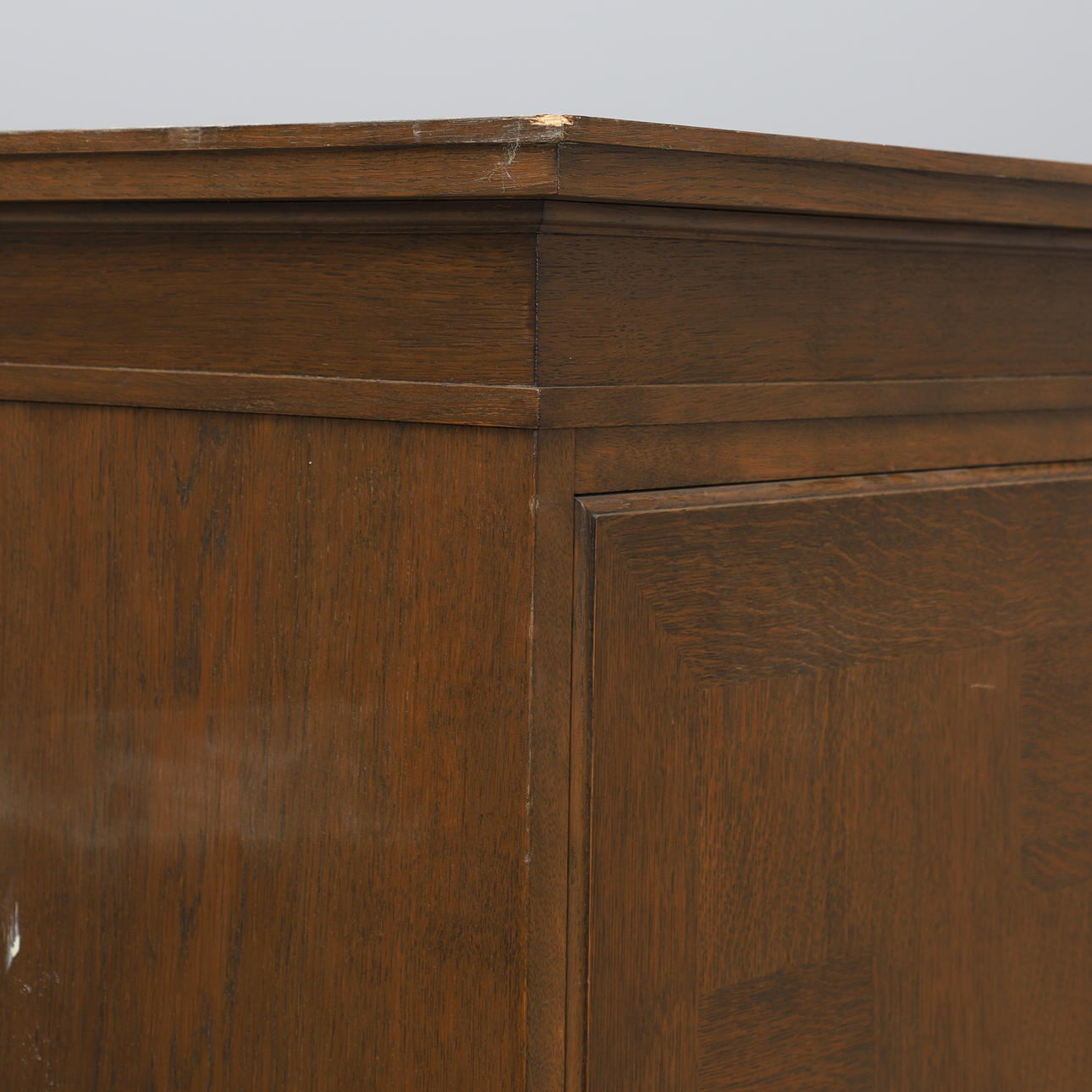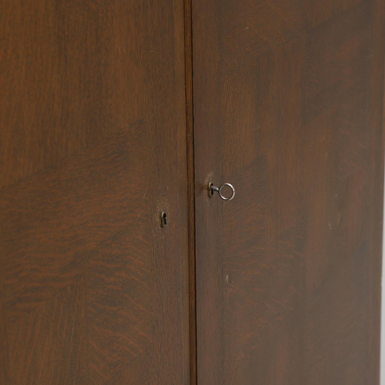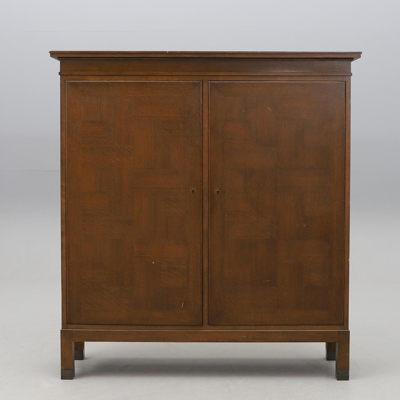 Stained oak. Straight shape, in the front two doors veneered in checkerboard pattern. Interior with 2 removable shelves, shelf carrier made of brass. Width 149, depth 45, height 160 cm.