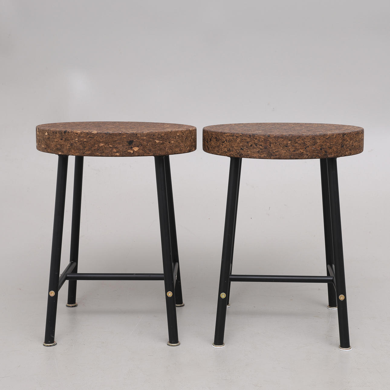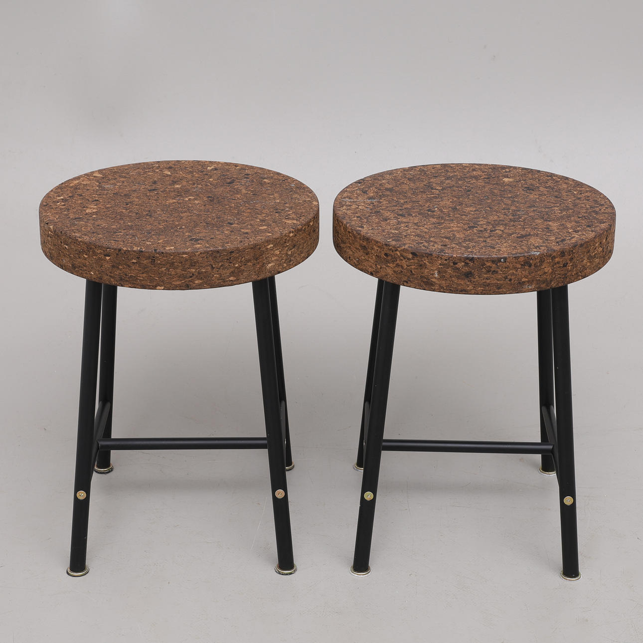 Seats in dark cork and frames in black lacquered metal, label marked, height 45,5 cm, diameter 34,5 cm.