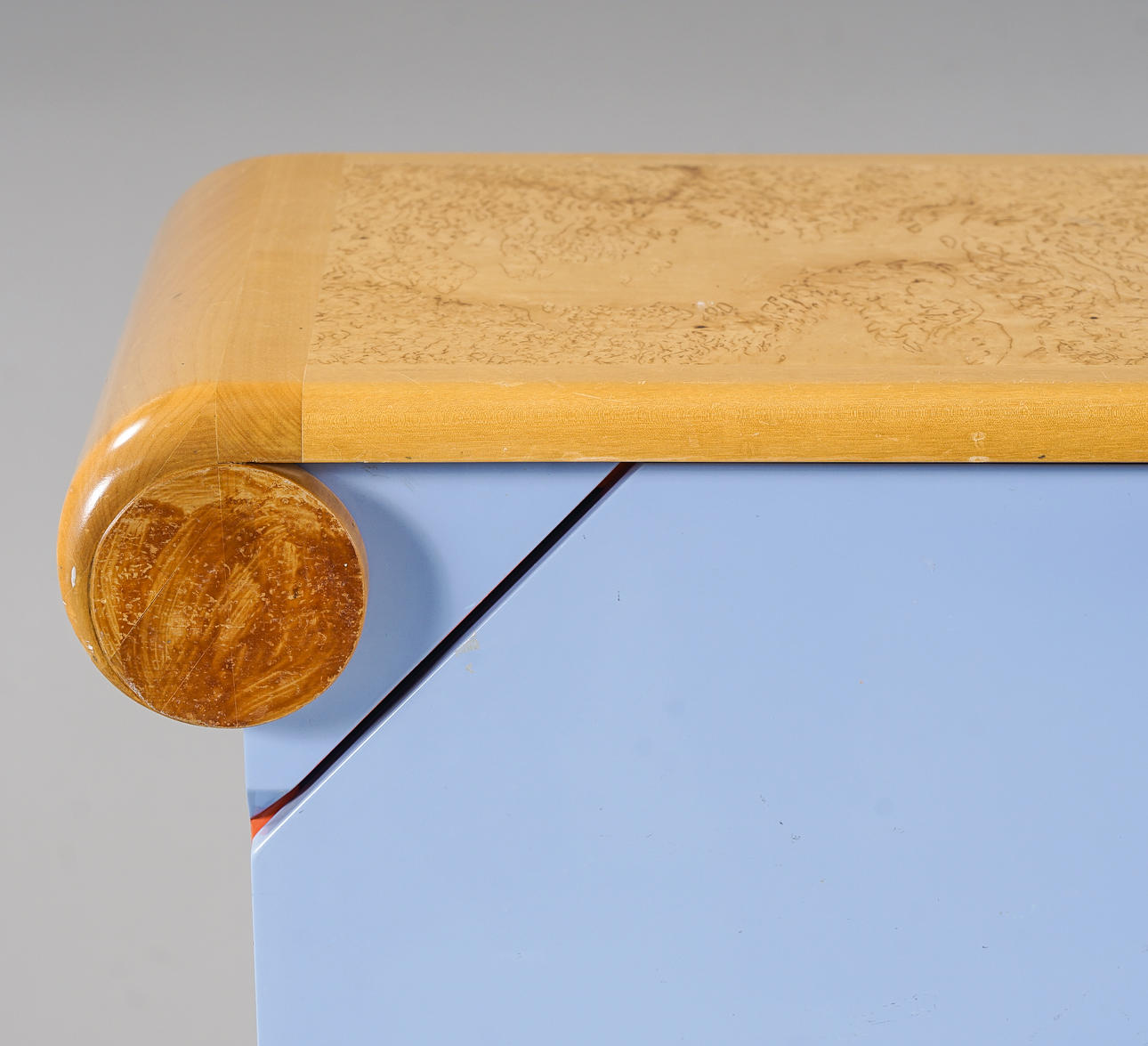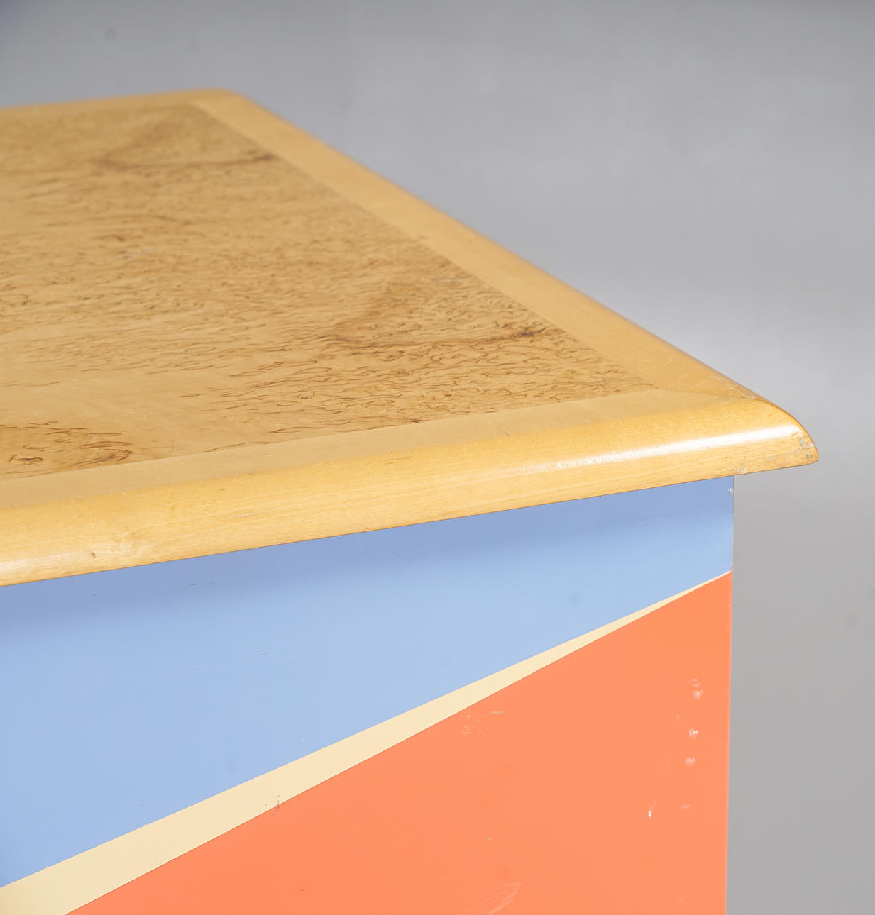Assymetrically shaped and varnished. Top board in birch and masur birch. Aluminum legs. Furnishing with shelves.