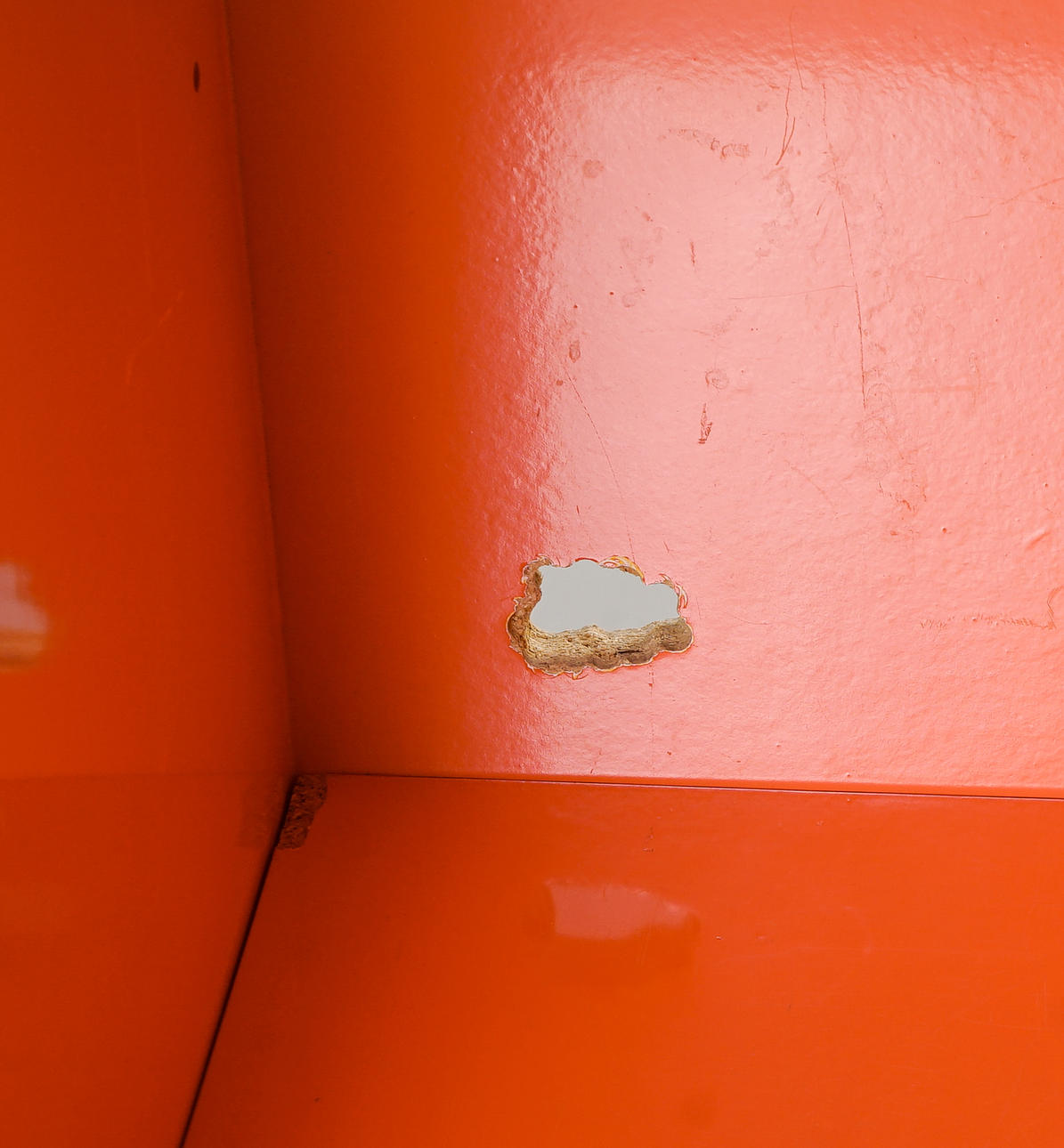 Bit by bit scratches, chafing and impact marks. less drilling in the back wall. A hinge sits slightly loose/loose against the door.