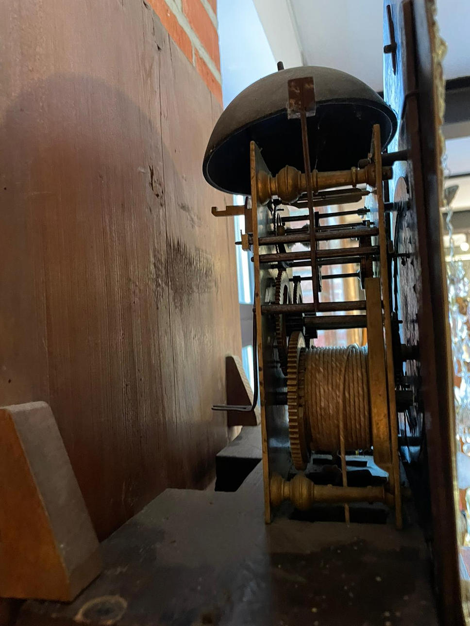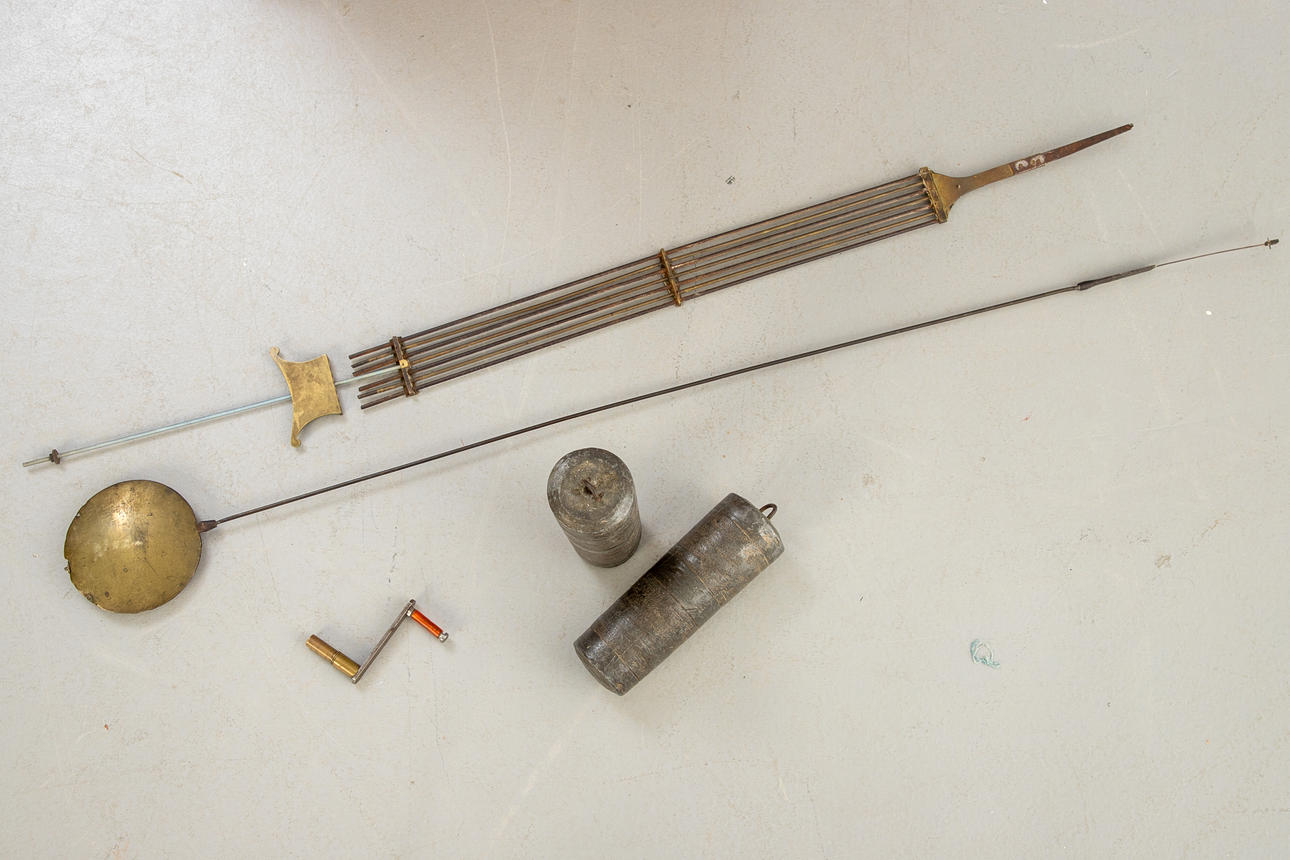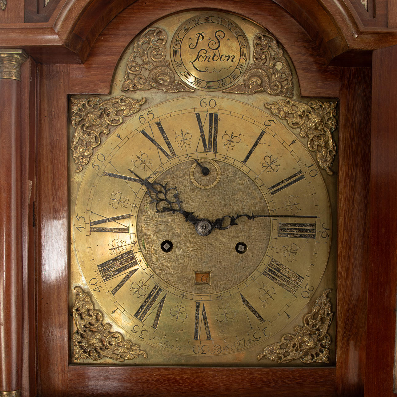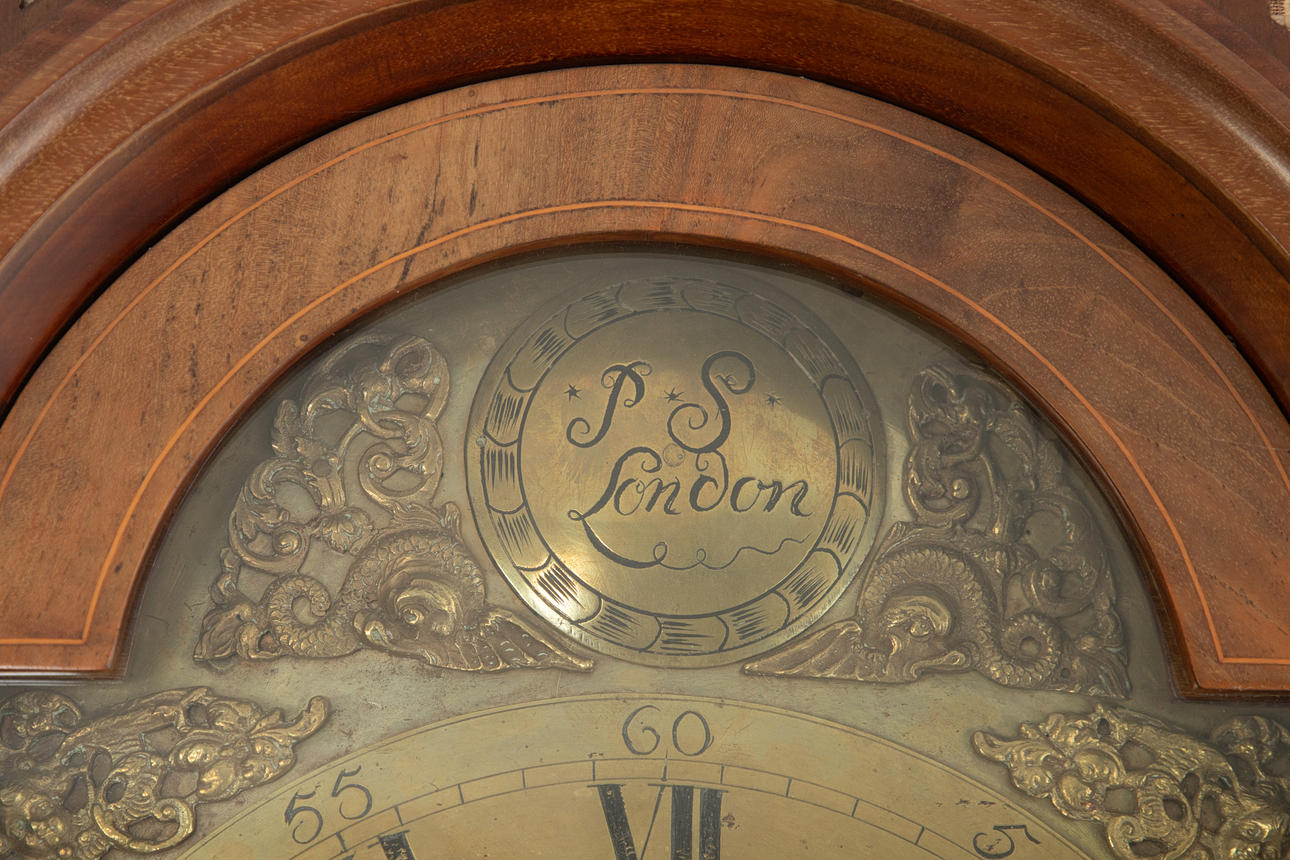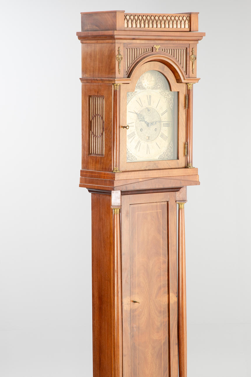 Mahogany wood case, solid and veneered. Removable attachment with glazing, brass dial with Arabic and Roman numerals and weekday display, brass applications in the corners. Bez.: P.S. London, Casper Breitfeldt. Pendulum, 2 weights, wind-up key and door key available.