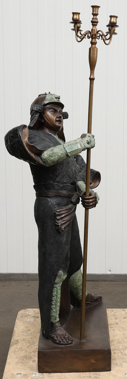 4307325. A BRONZE SAMURAI SCULPTURE with candelabra.