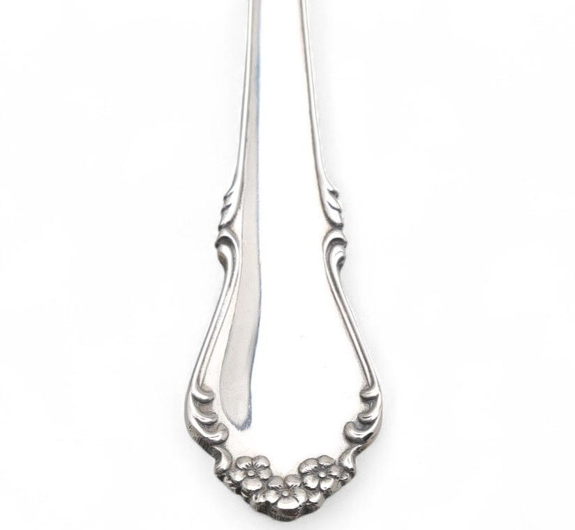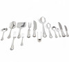 Six pieces for each diner. Unengraved. It consists of: main forks, soup spoons, meat knives, dessert forks, dessert spoons, dessert knives and 8 service pieces. It includes some pieces from other sets (children's spoon, shell spoon, pair of napkin holders, pair of large forks and pair of soup spoons).