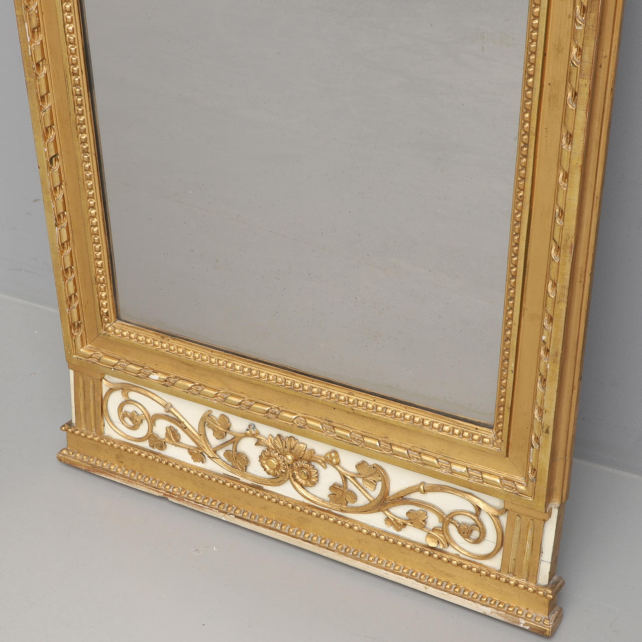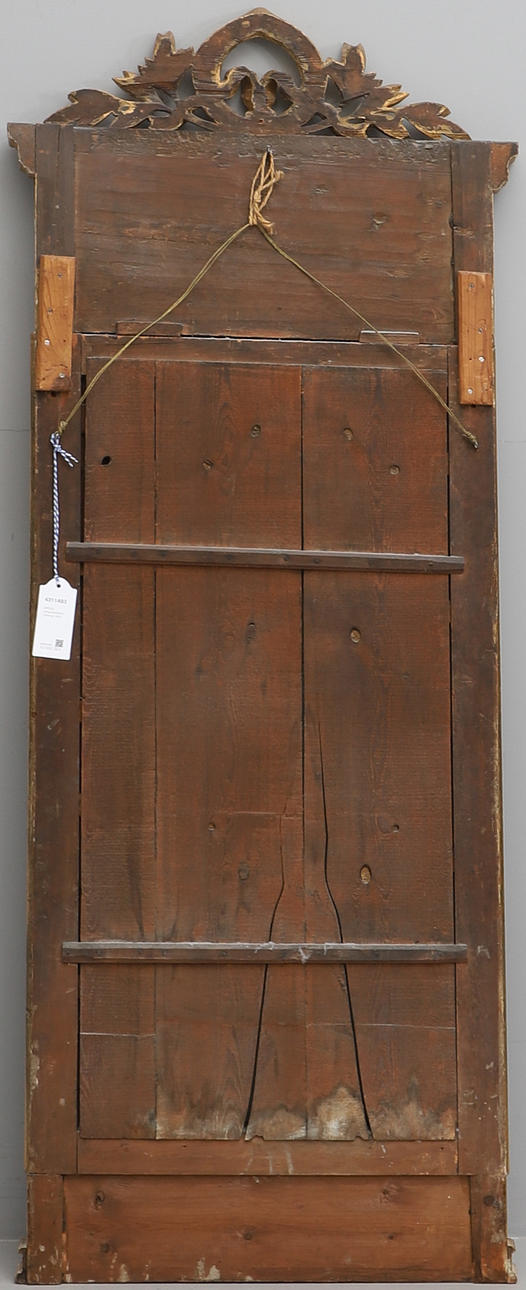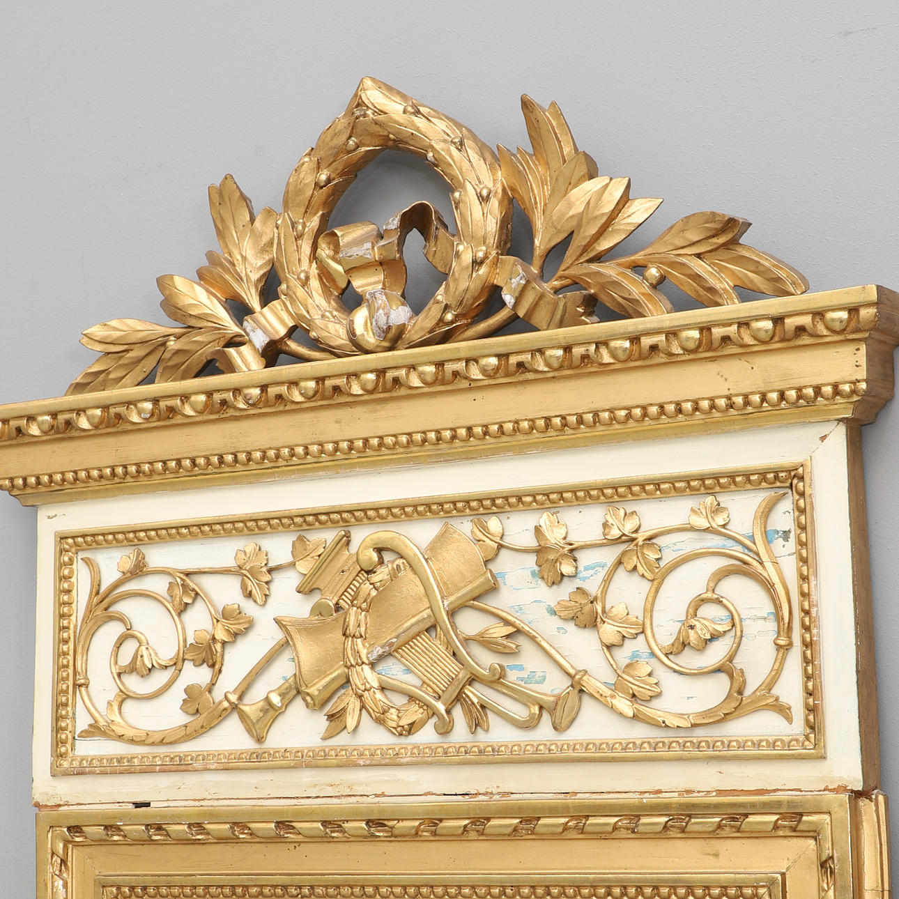 Gilded and painted. Loose crown bow and laurel wreath, top decorated with lyre and wind instruments, among others. Height 189, width 76 cm.
