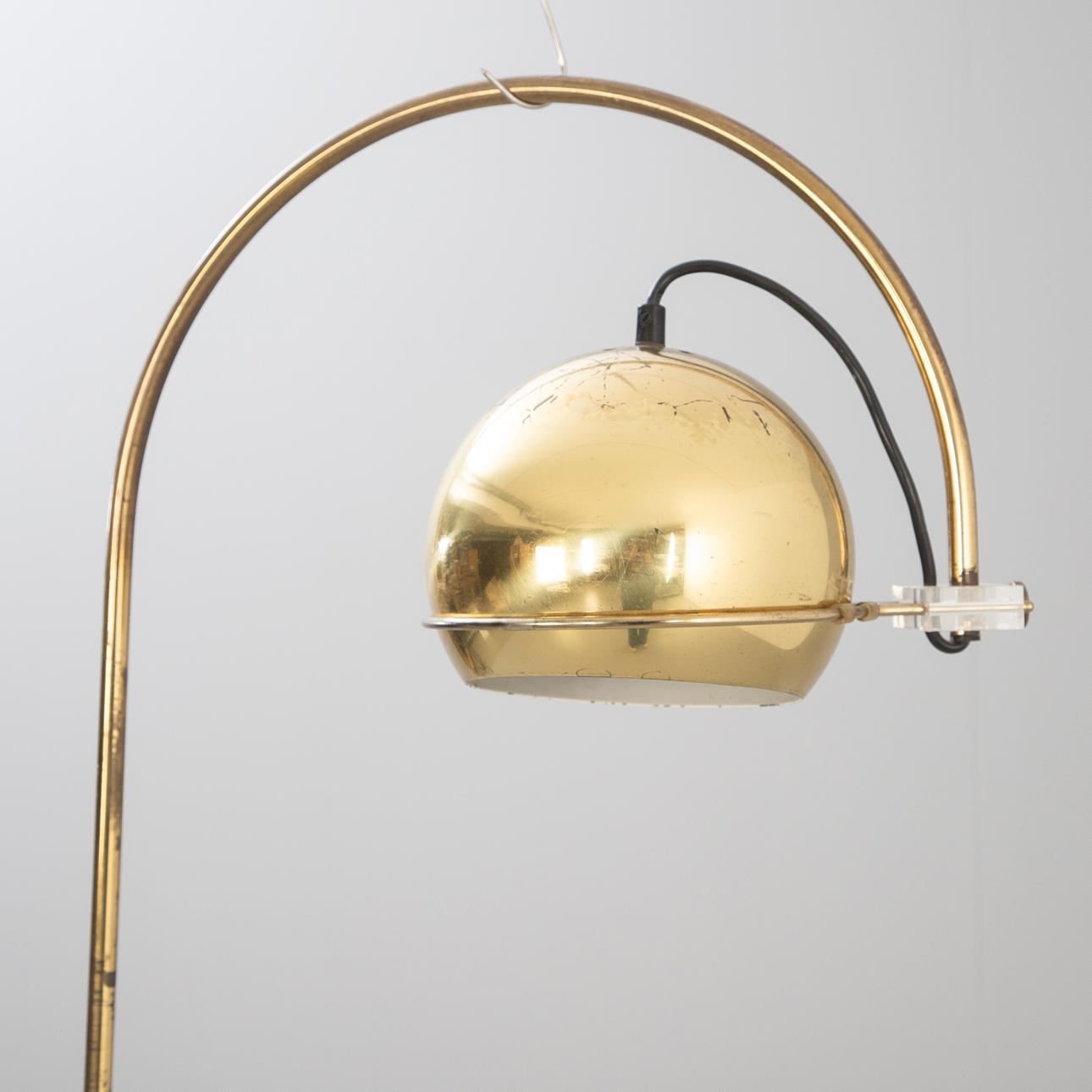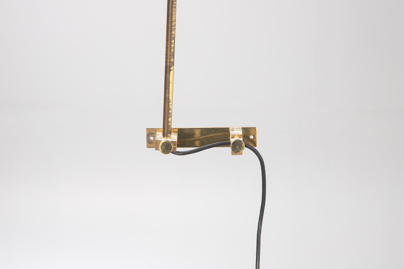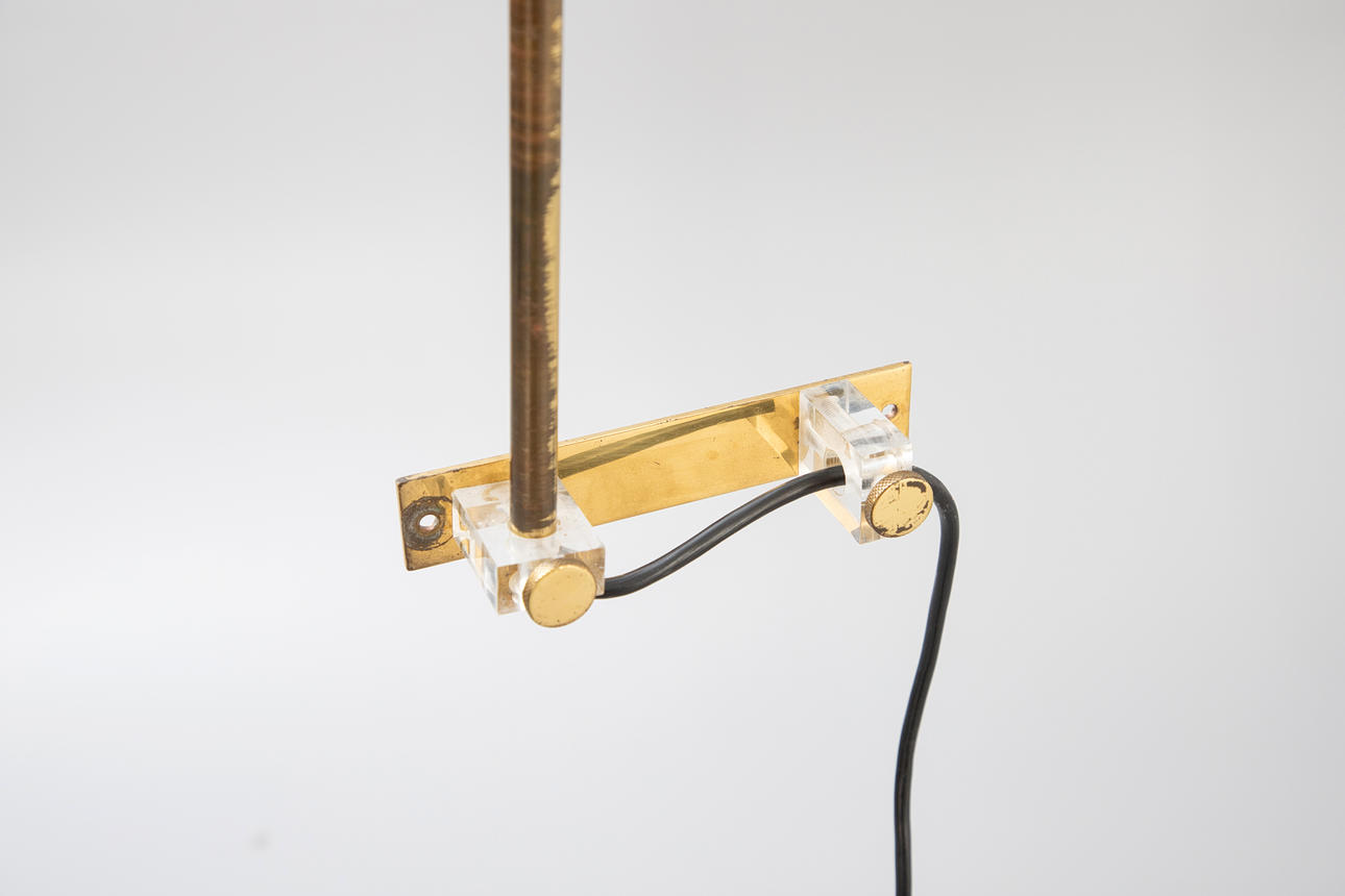 Wall lamp with brass ball reflector (Ø 20 cm). Multi-adjustable brass construction, acrylic glass details, a flame point, E14 socket.