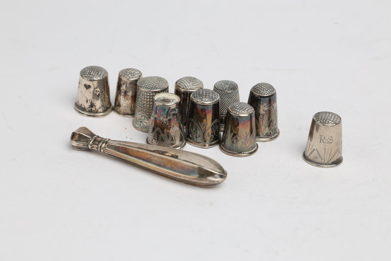 4313058. 10 silver thimbles and a needle case, 19th/20th century.