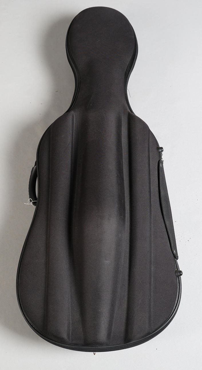 3/4 cello by Romanian maker Michael Poller, label dates this cello to 1995, together with a black carrying case, cello measures 109cm length.