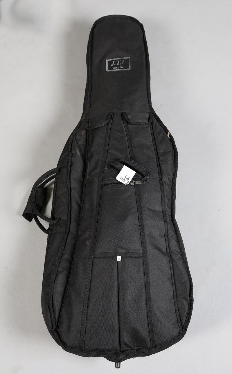 The 3/4 cello labelled 'Made In Hungary', together with an unmarked bow and soft carrying case by J.T.L, cello measures 103cm length.