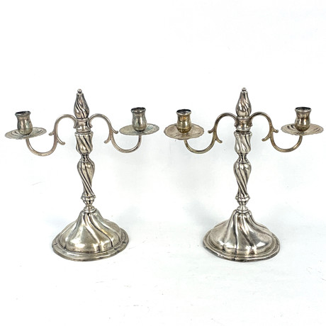 Pair of three - armed candelabra, each four bronze light cuffs.