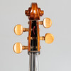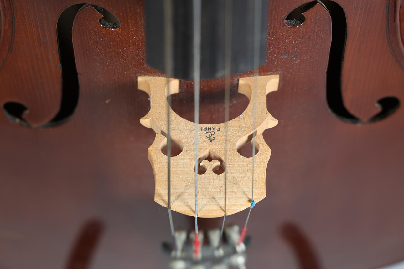 The unlabelled 3/4 cello with 'Panpi' bridge, together with an unmarked bow and black soft carrying case, cello measures 111cm length.