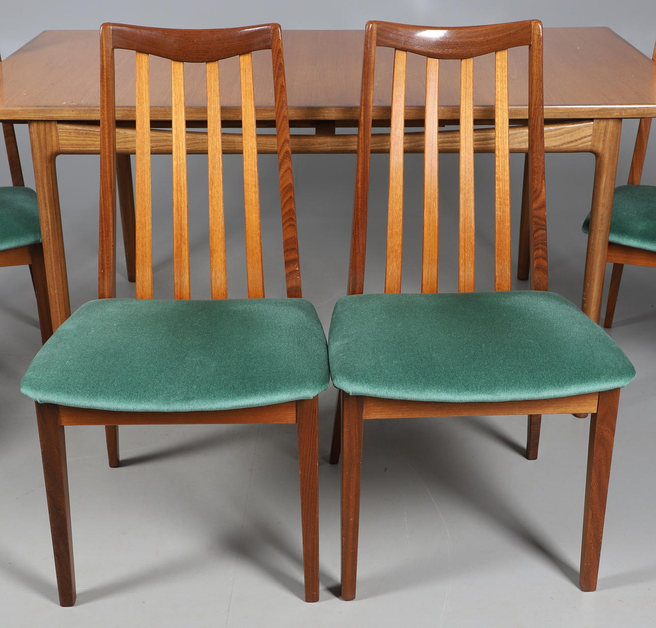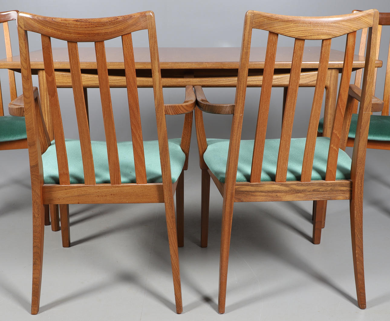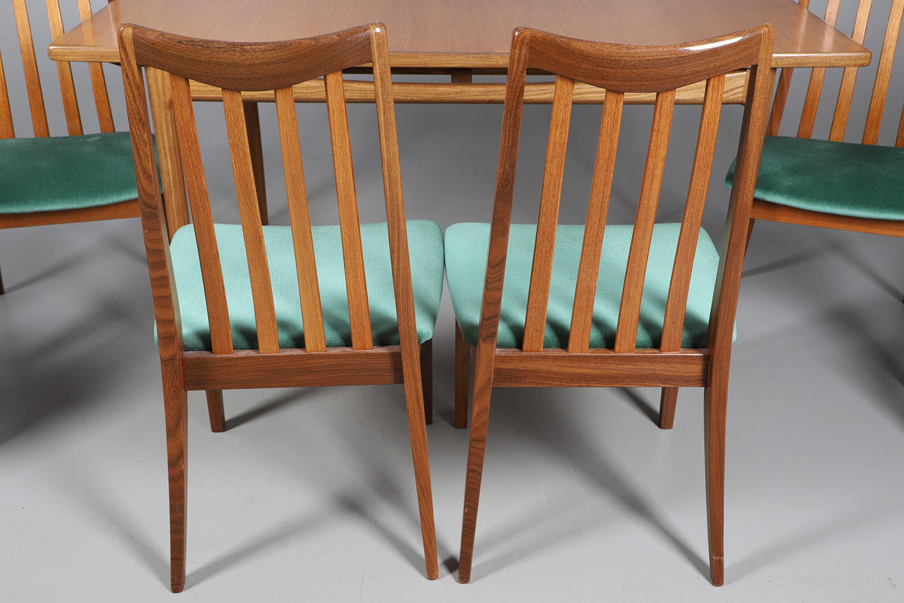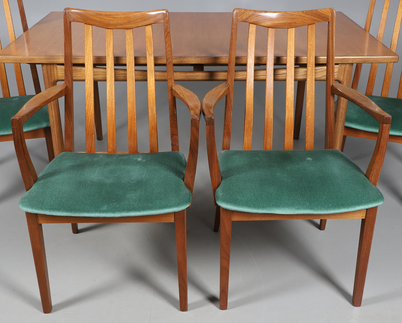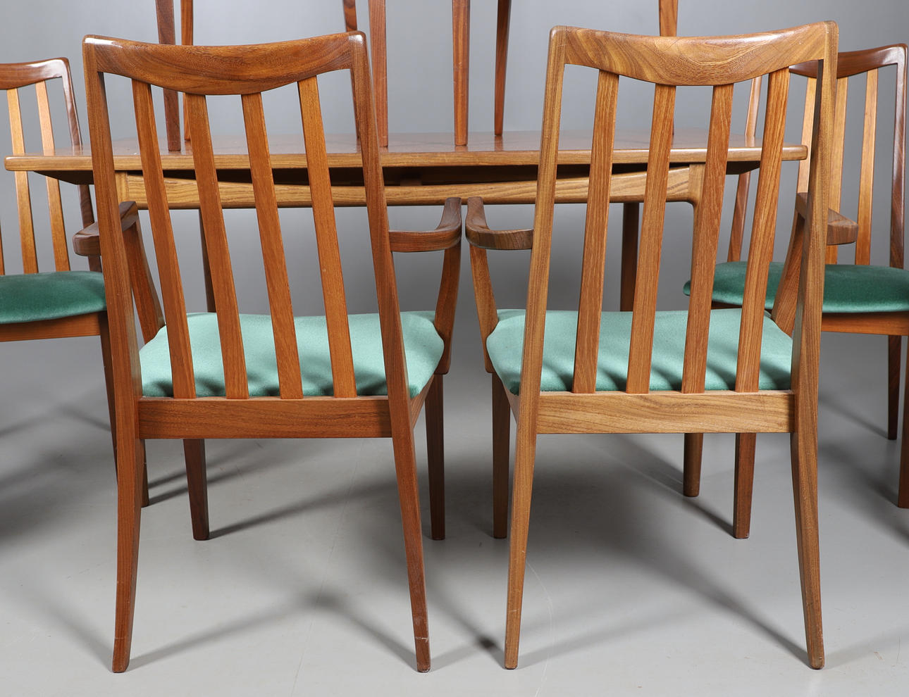 Including a teak extending dining table, with pull out ends to support leaves at each end, of rectangular shape and with two leaves stored at one table of the table in a recess (152cms by 88.5cms, 72cms high). Also with a set of eight dining chairs, the slat back chairs with green covered seats (four are elbow chairs, 90cms high).