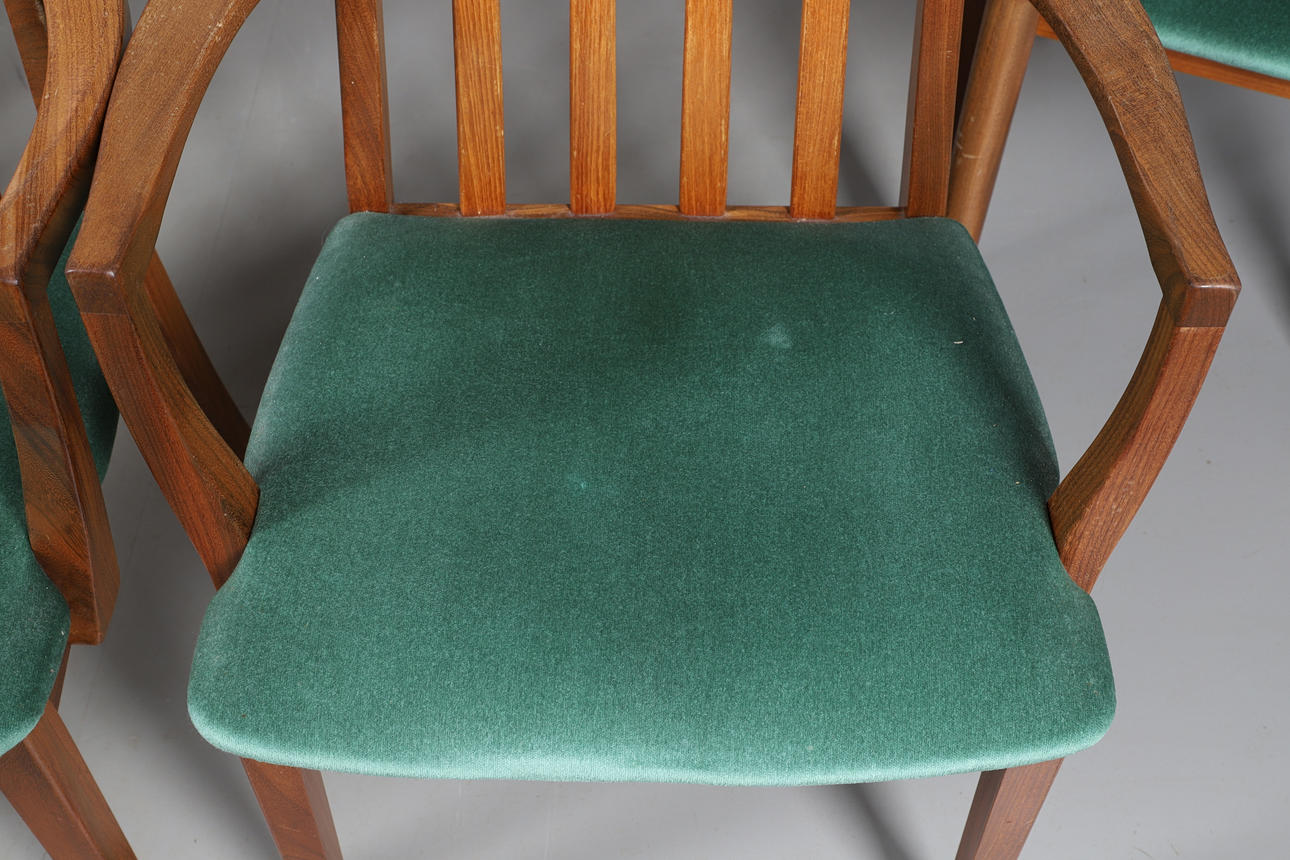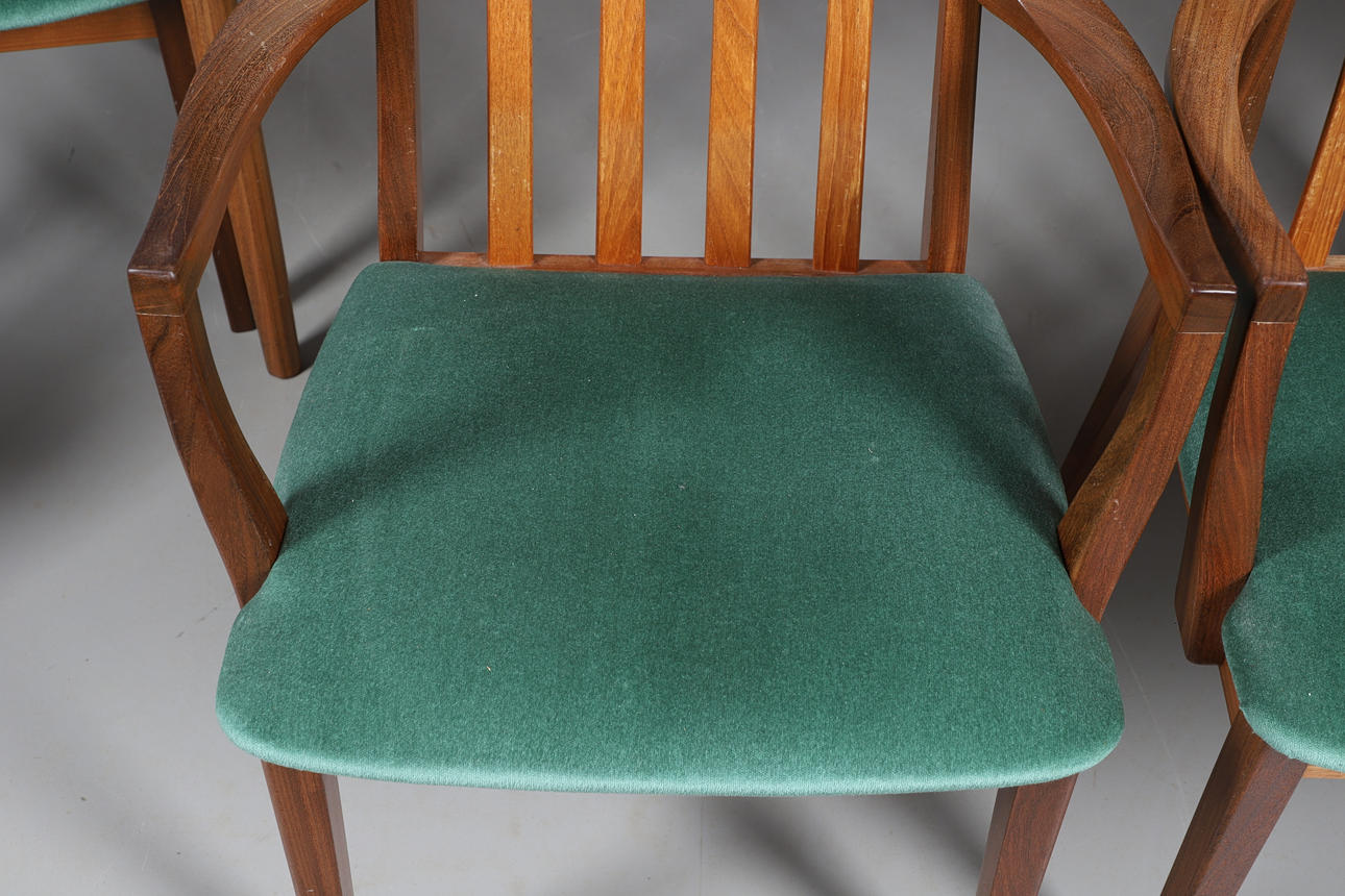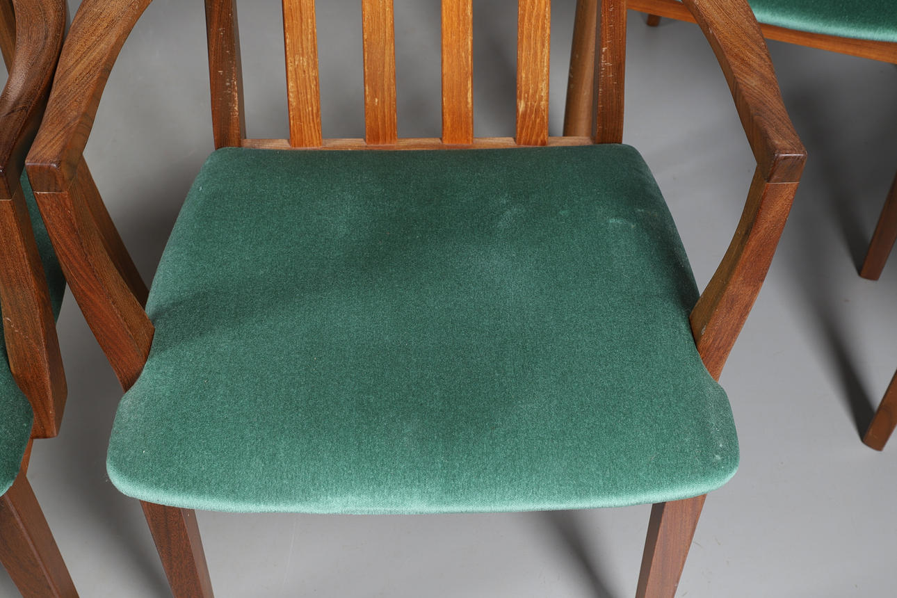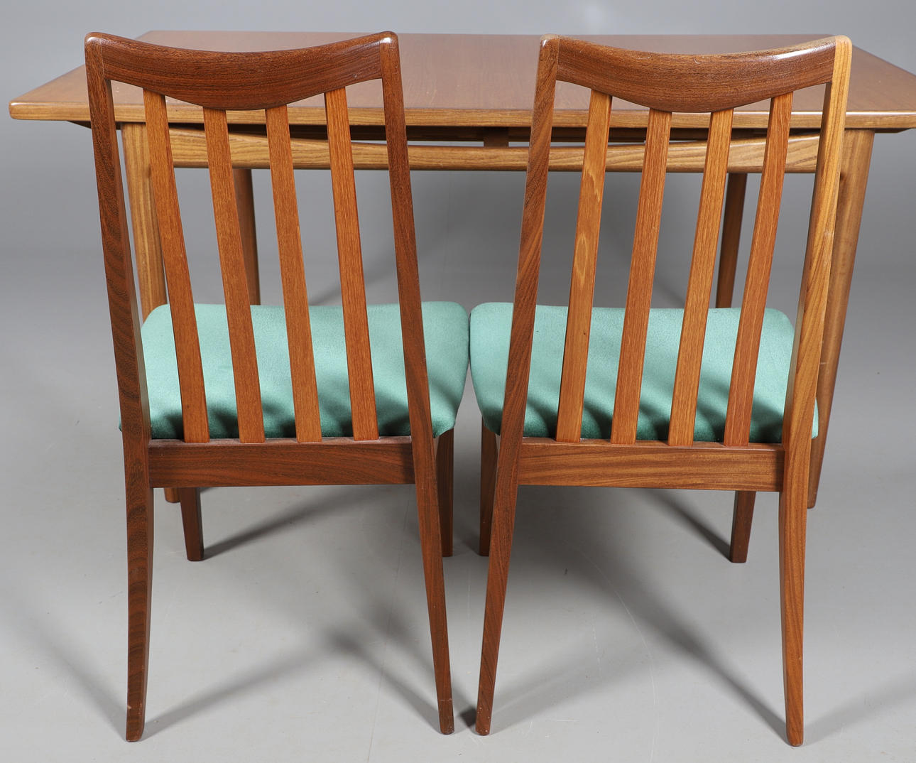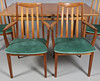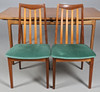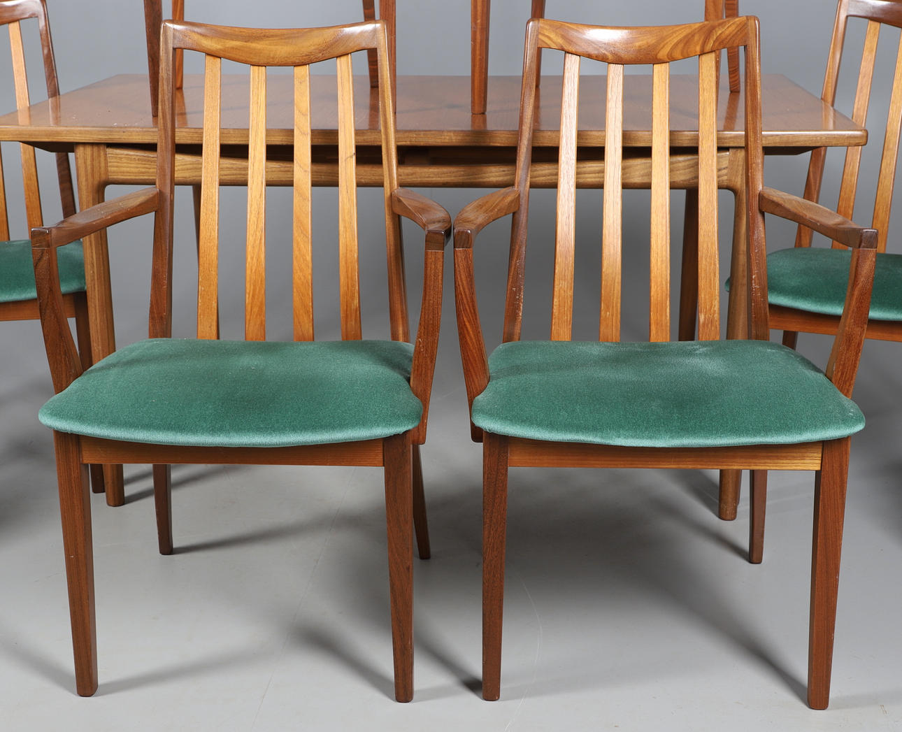 Including a teak extending dining table, with pull out ends to support leaves at each end, of rectangular shape and with two leaves stored at one table of the table in a recess (152cms by 88.5cms, 72cms high). Also with a set of eight dining chairs, the slat back chairs with green covered seats (four are elbow chairs, 90cms high).