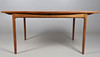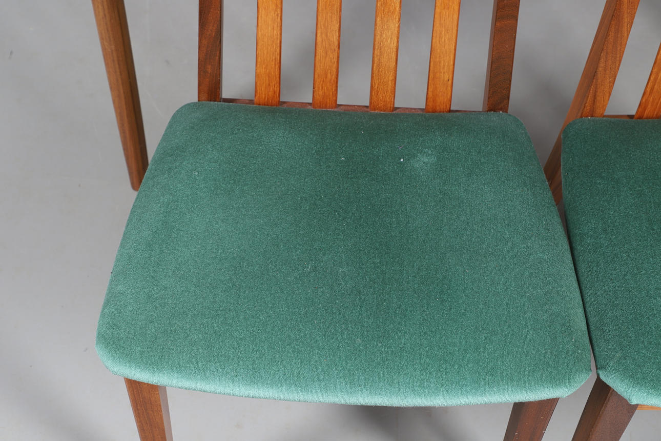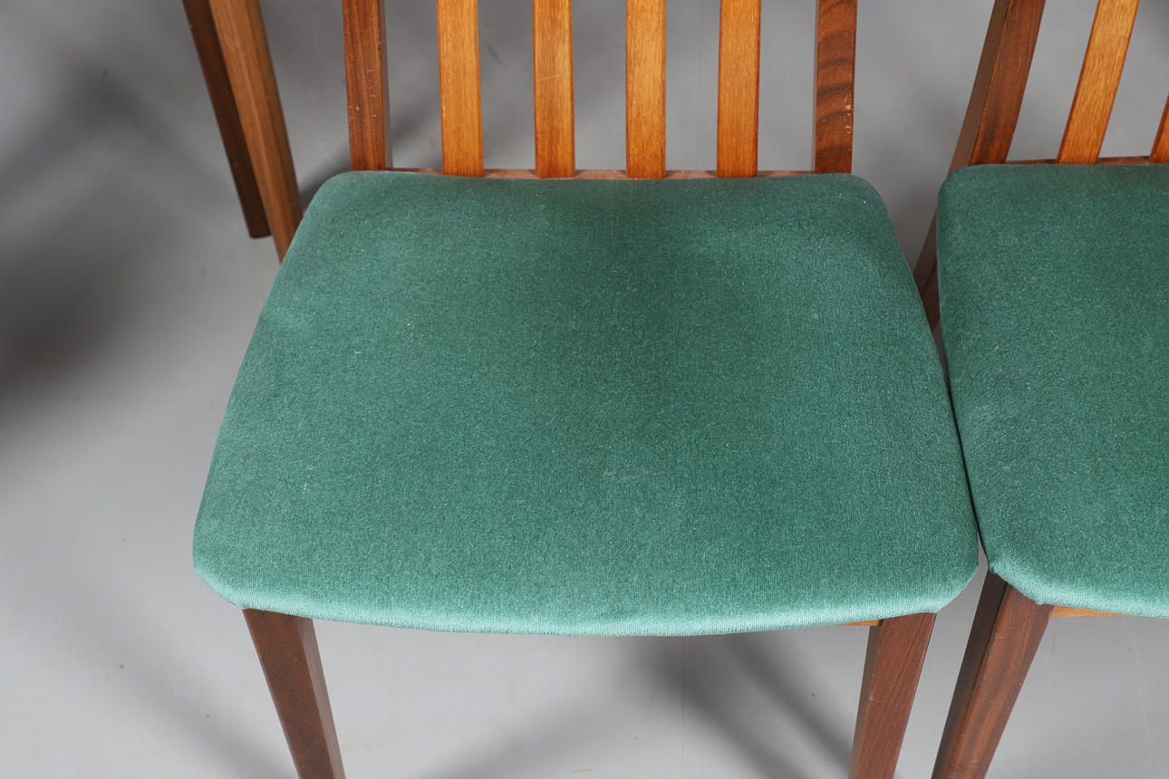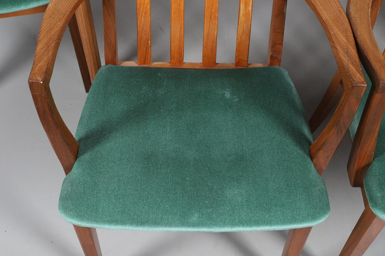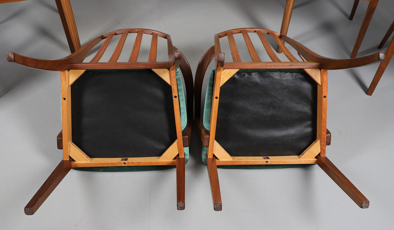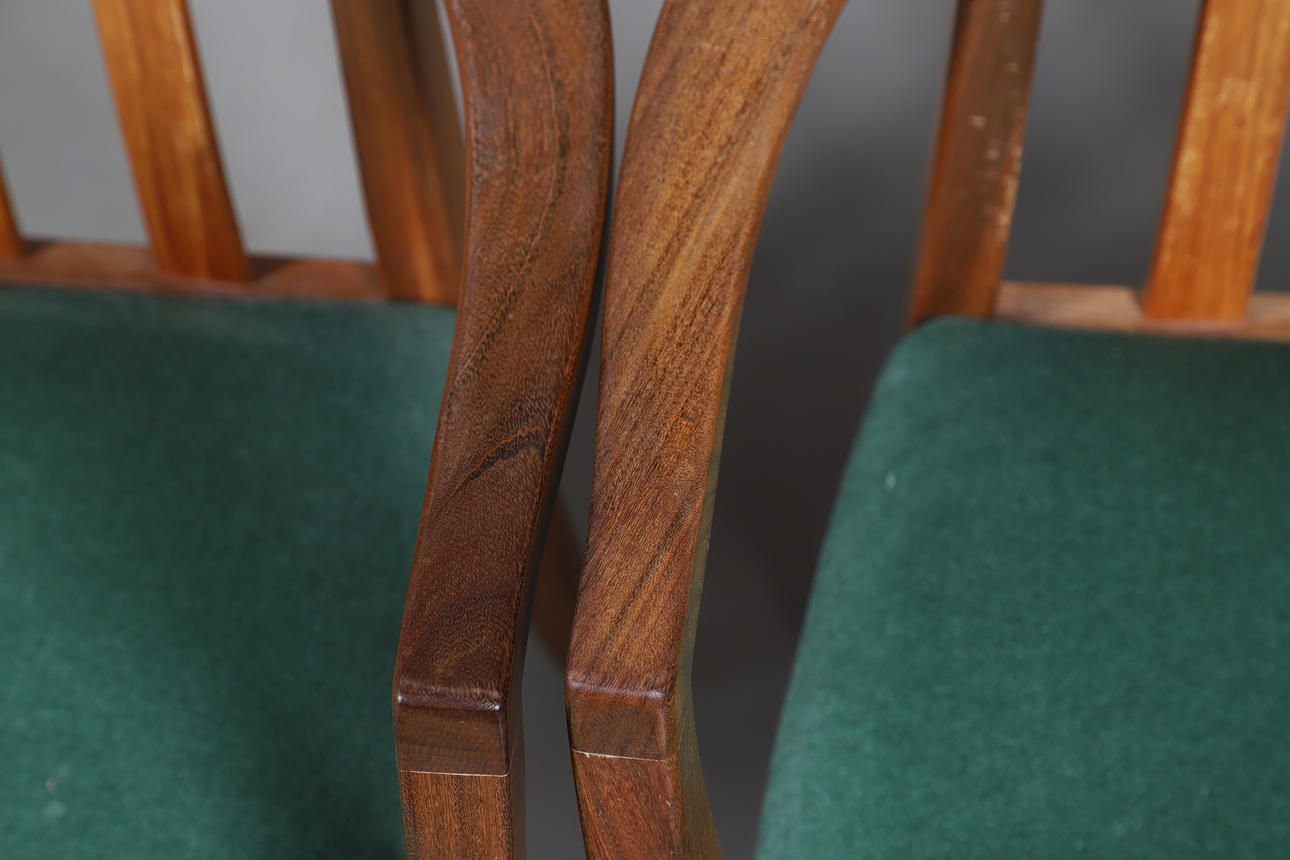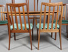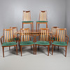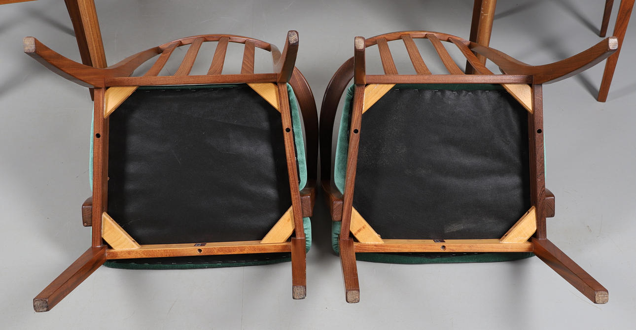 Including a teak extending dining table, with pull out ends to support leaves at each end, of rectangular shape and with two leaves stored at one table of the table in a recess (152cms by 88.5cms, 72cms high). Also with a set of eight dining chairs, the slat back chairs with green covered seats (four are elbow chairs, 90cms high).