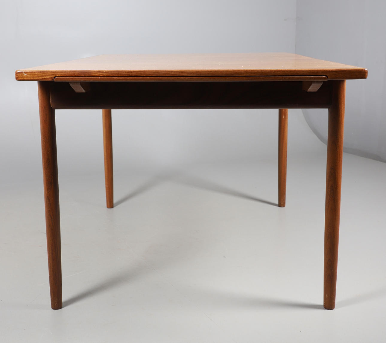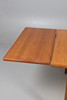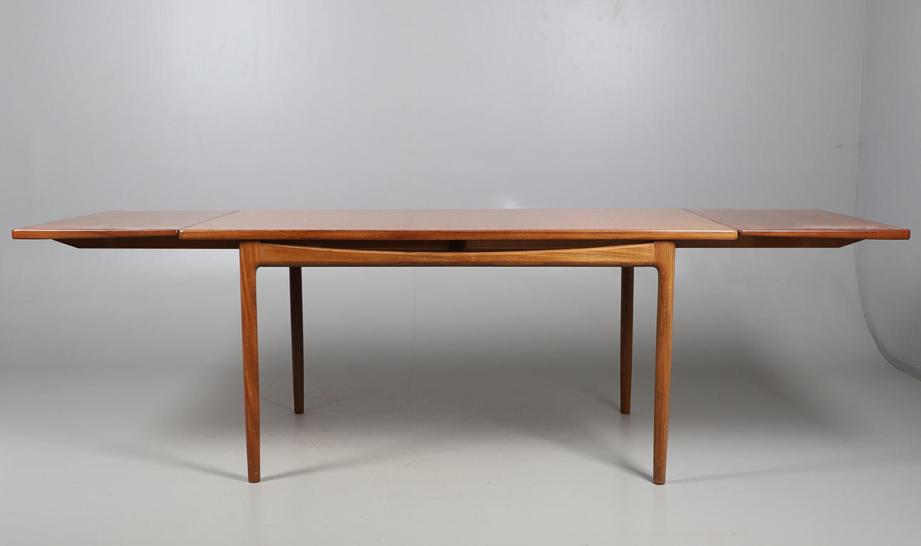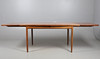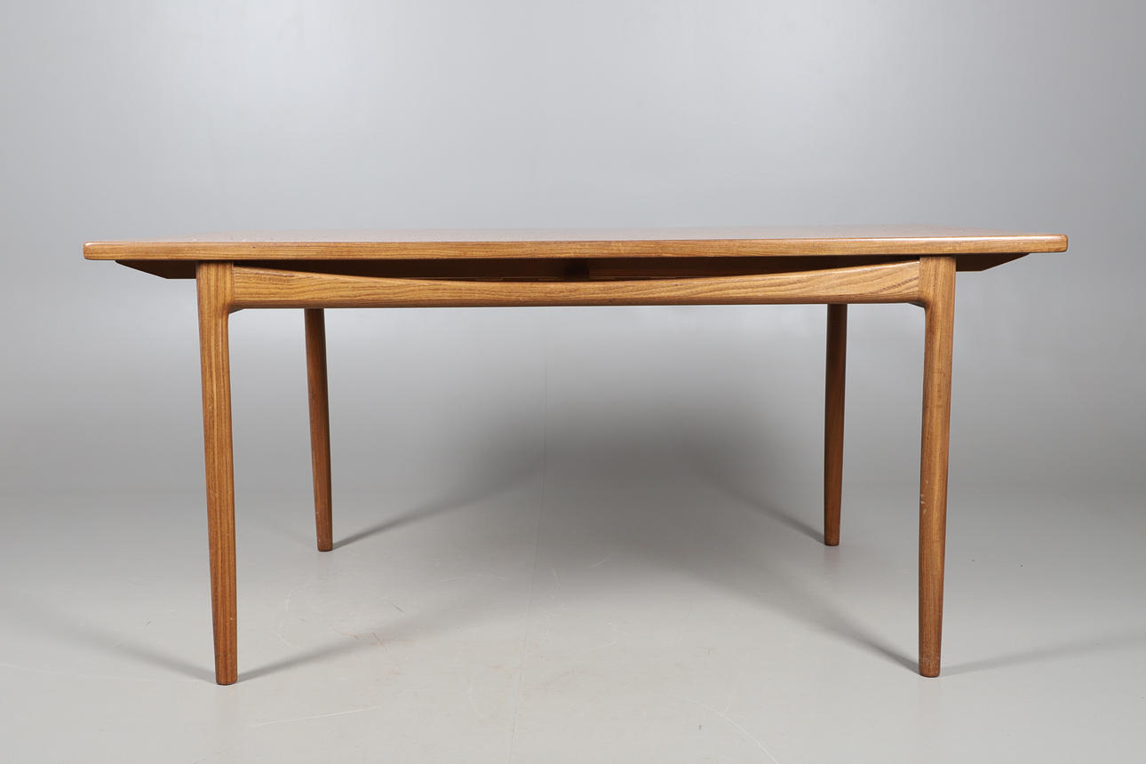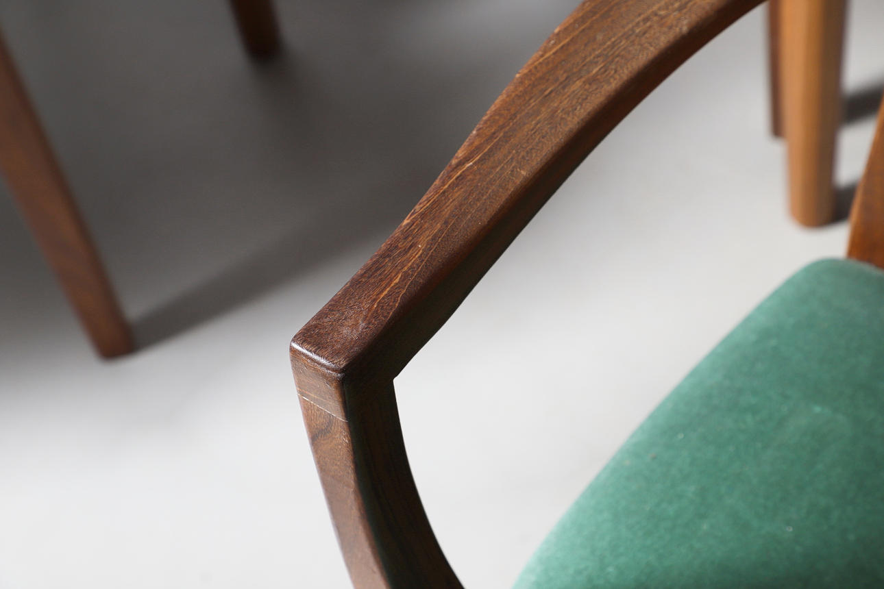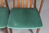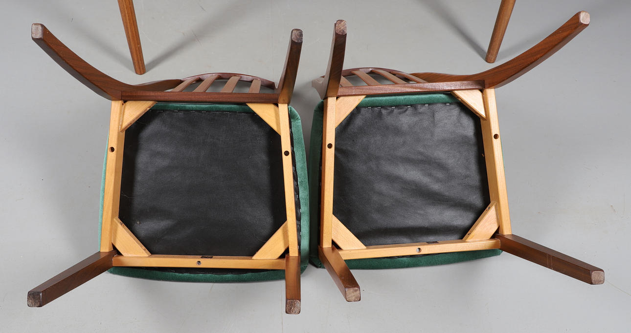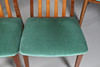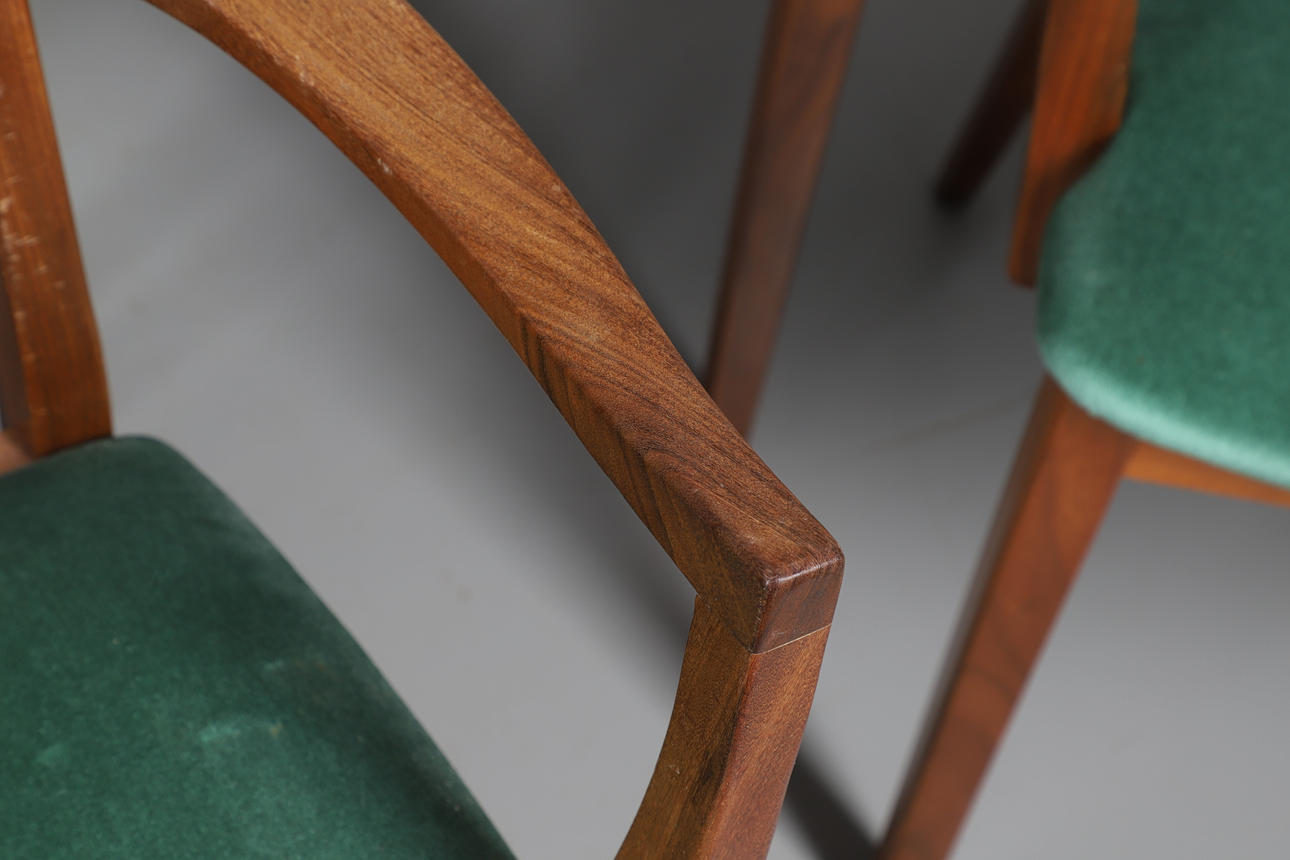 Including a teak extending dining table, with pull out ends to support leaves at each end, of rectangular shape and with two leaves stored at one table of the table in a recess (152cms by 88.5cms, 72cms high). Also with a set of eight dining chairs, the slat back chairs with green covered seats (four are elbow chairs, 90cms high).