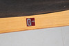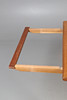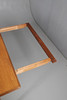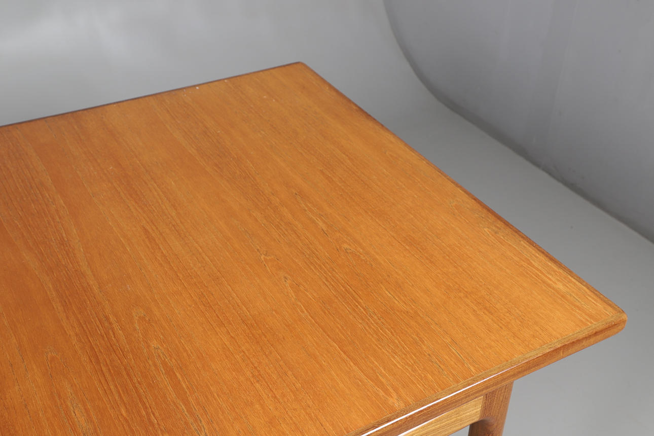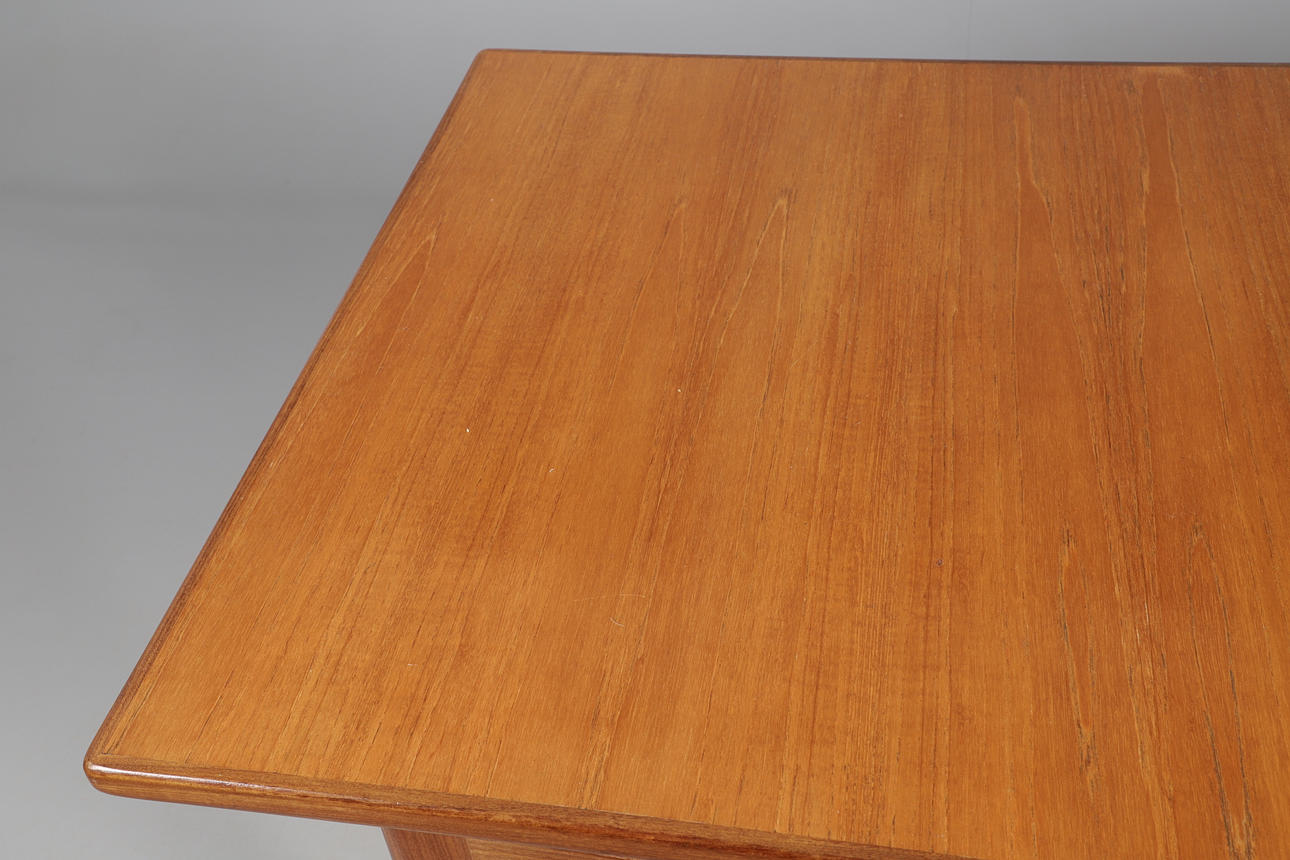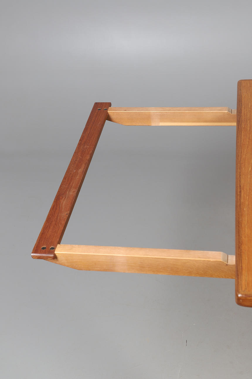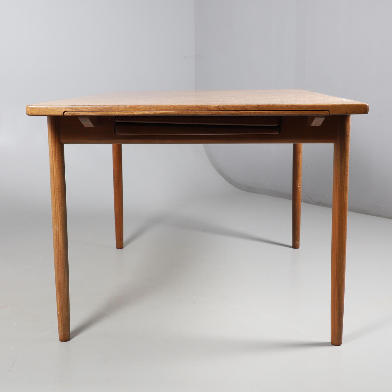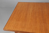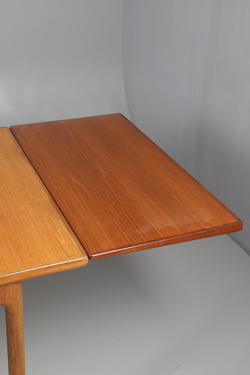 Including a teak extending dining table, with pull out ends to support leaves at each end, of rectangular shape and with two leaves stored at one table of the table in a recess (152cms by 88.5cms, 72cms high). Also with a set of eight dining chairs, the slat back chairs with green covered seats (four are elbow chairs, 90cms high).
