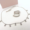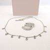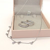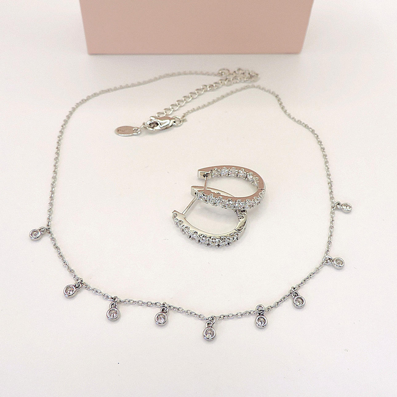 A sterling silver 16 inch necklace with 9 dainty round cut floating Cubic Zirconia with a pair of sterling silver hoop earrings set with round Cubic Zirconia.