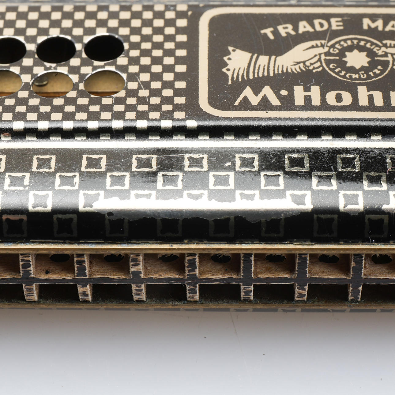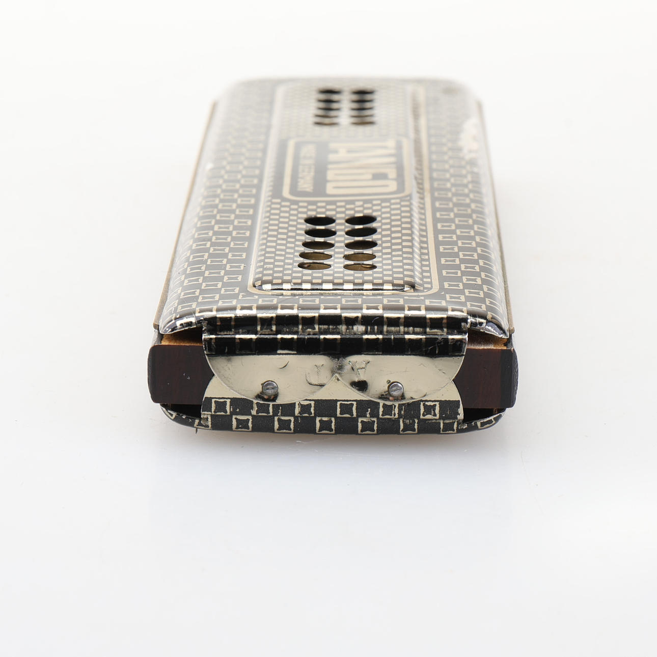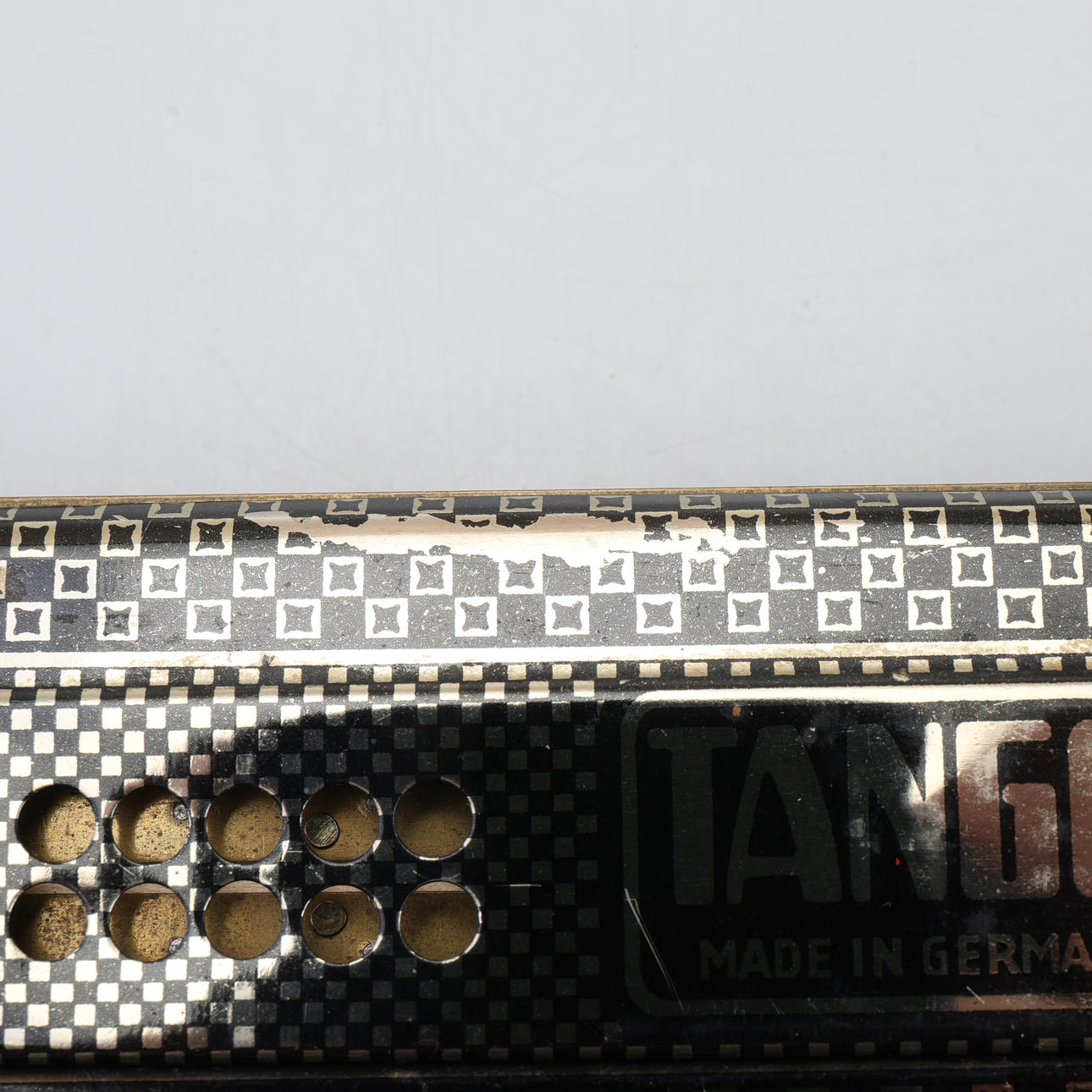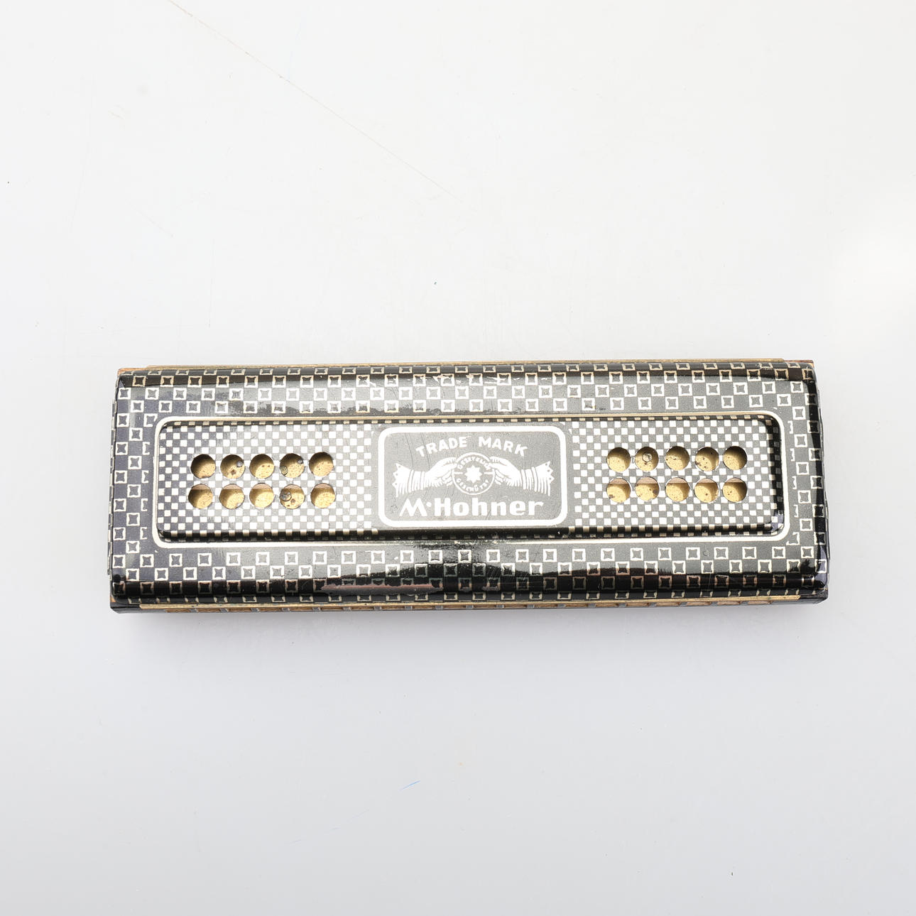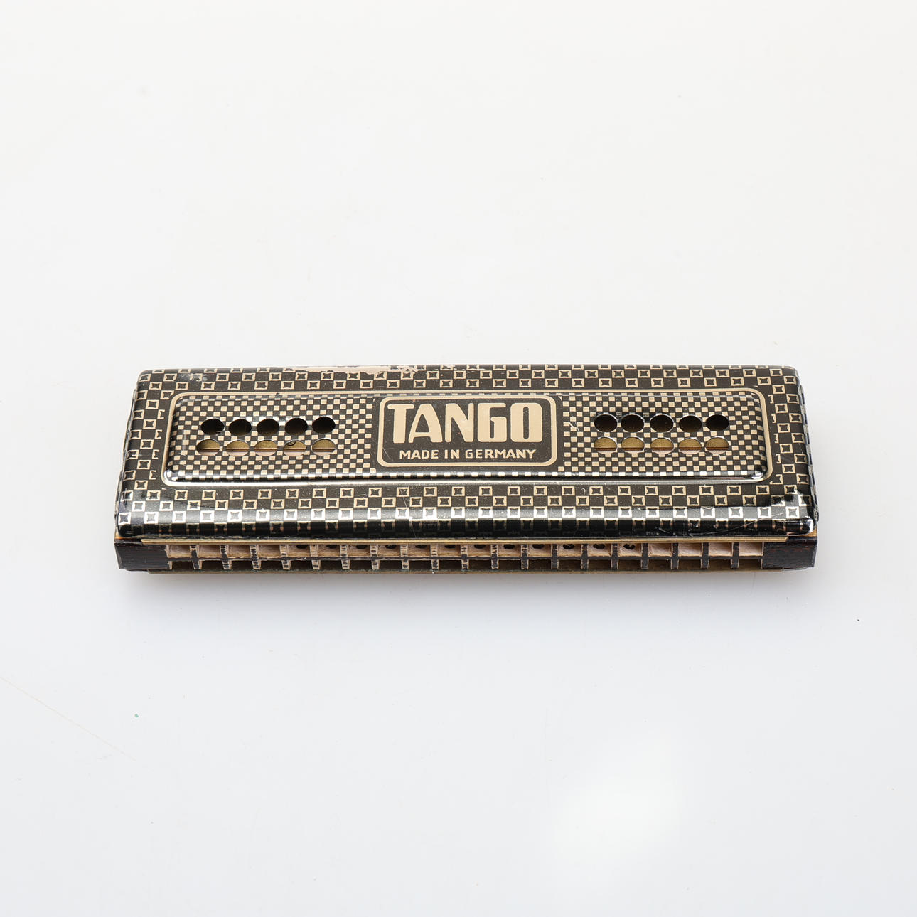 Harmonica marked Trade mark M. Hohner, Tango made in Germany. Length 20,5 cm, width 5,5 cm. Original box.