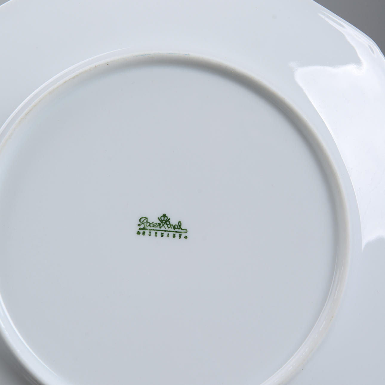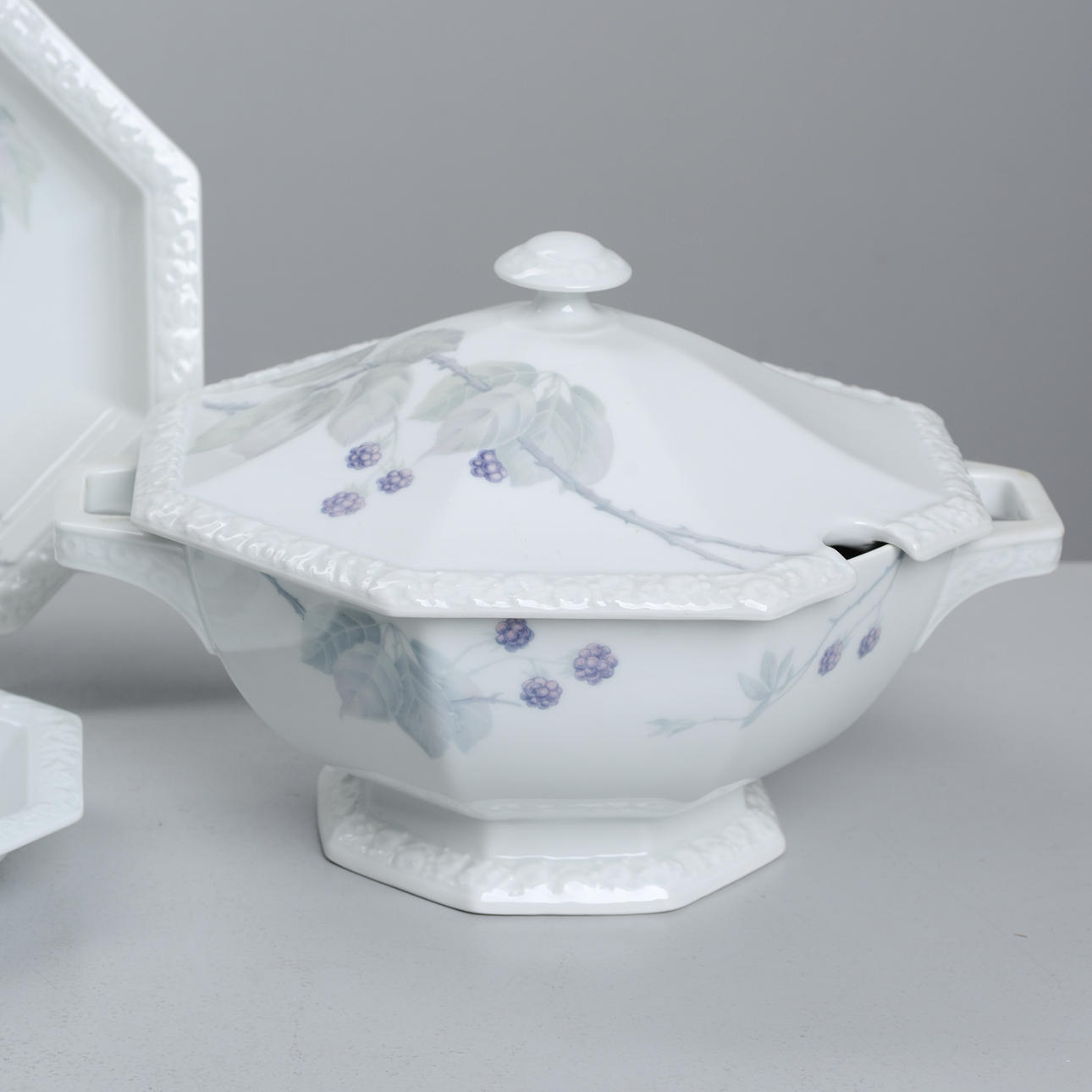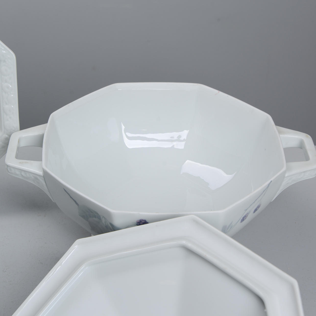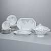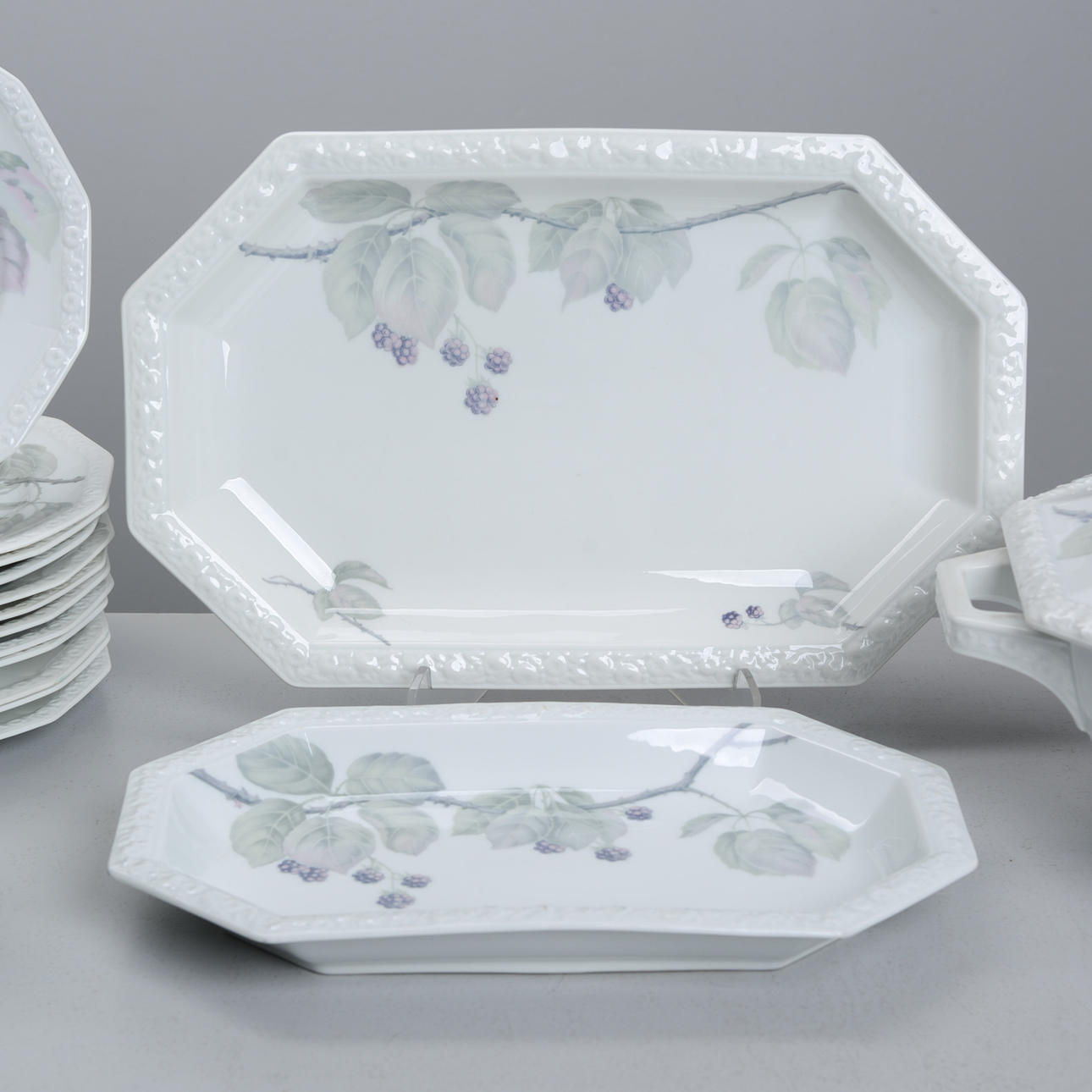 1 mushroom terrine, diameter: 29 cm. 2 serving plates, length: 32, 38 cm. 12 side dishes, diameter: 21 cm. 10 dessert plates, diameter: 17.5 cm.