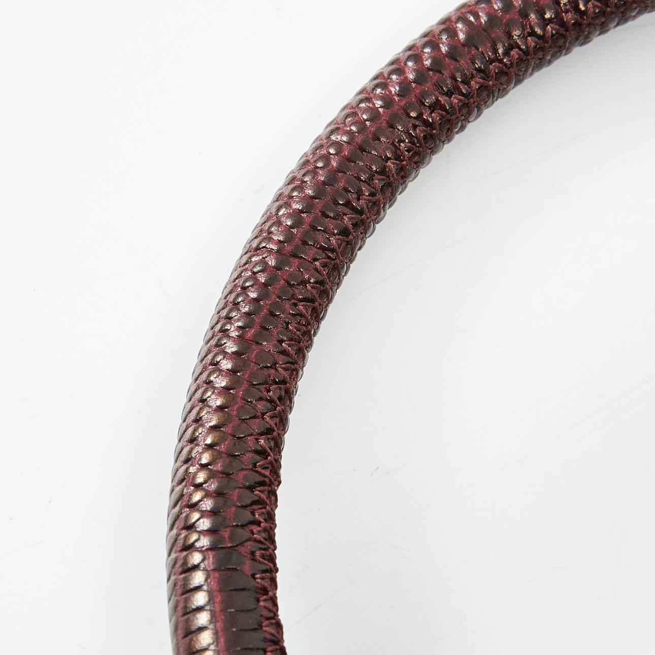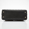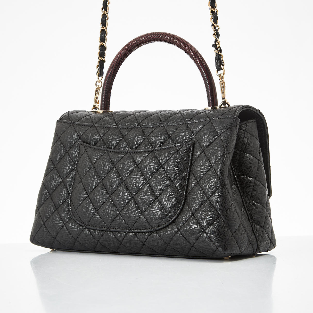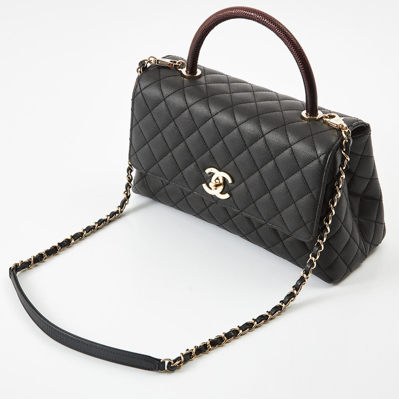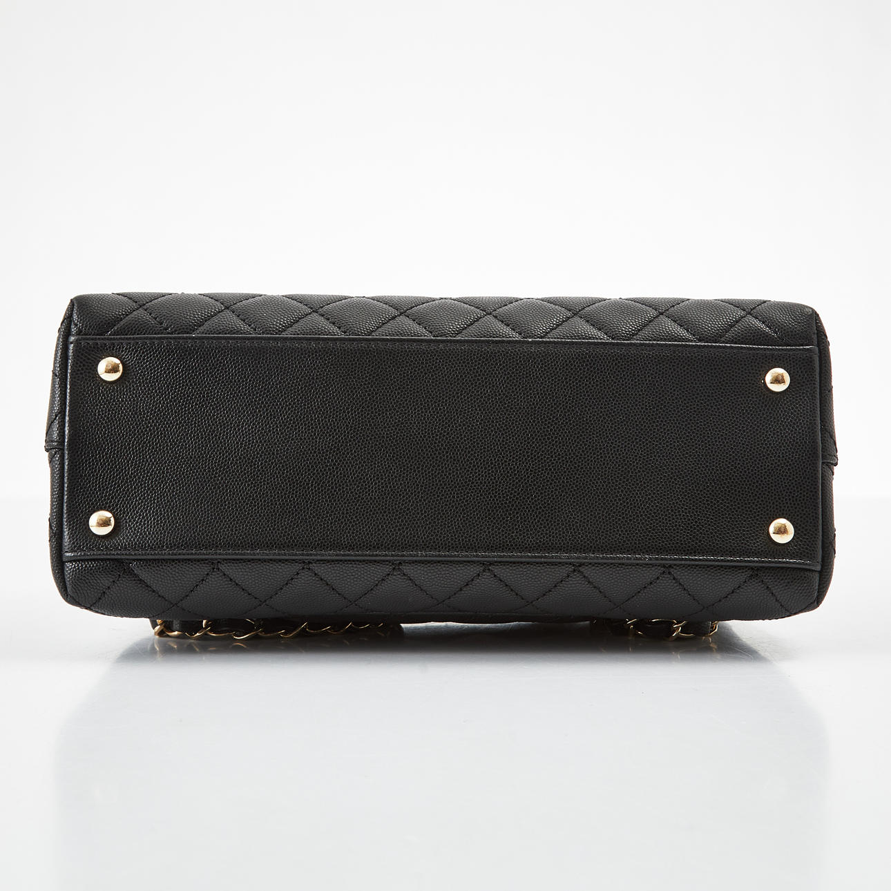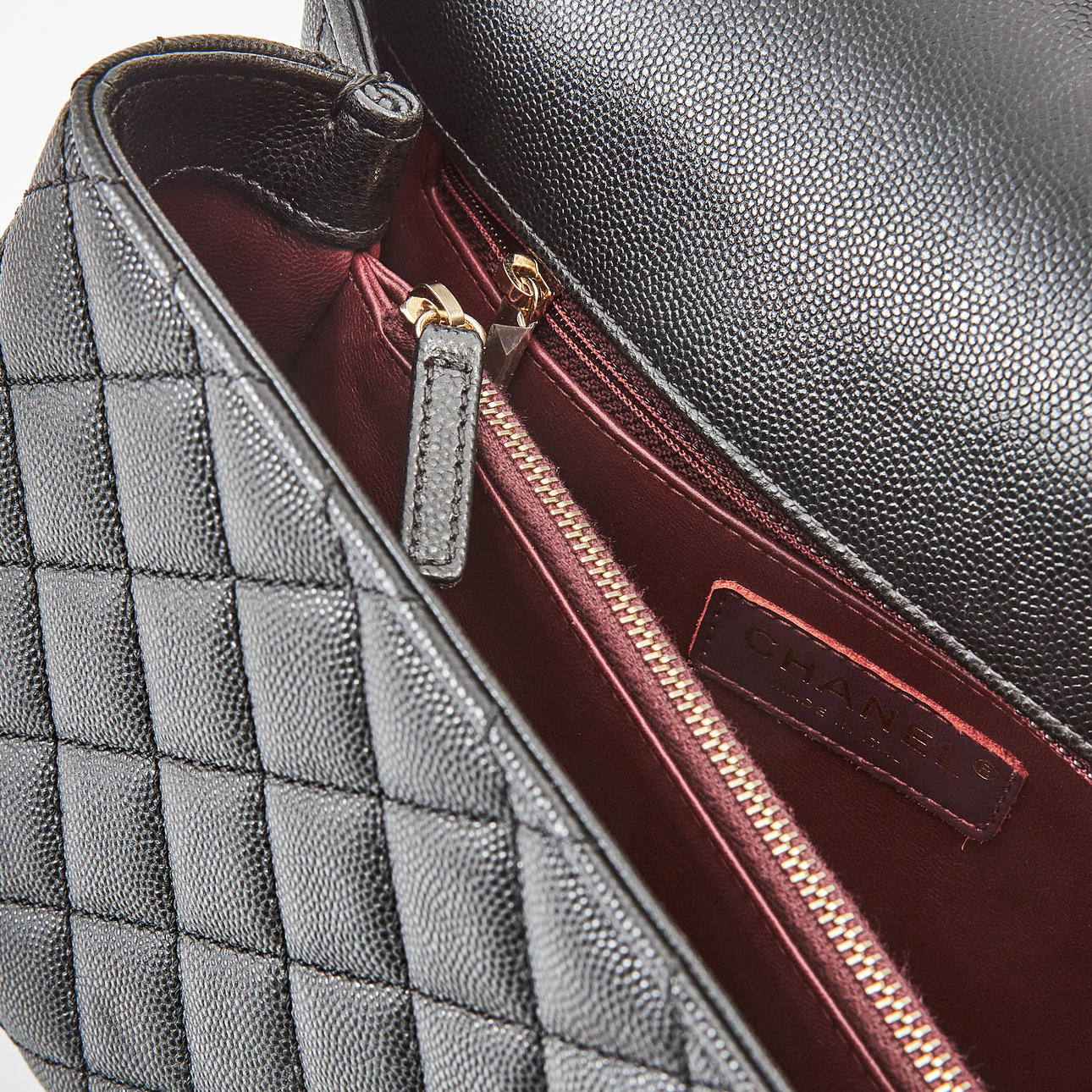 In quilted caviar leather with matching knits, oxblood colored tophandle, detachable shoulder strap with chain in yellow metal with twisted leather, back with compartment, CC buckle in yellow metal, lined in oxblood red leather, inside two storage areas and two pockets with zipper and two without, marked “Chanel made in Italy”, chip marked, dimensions approx. 29x17x17 x15, handle drop 10cm