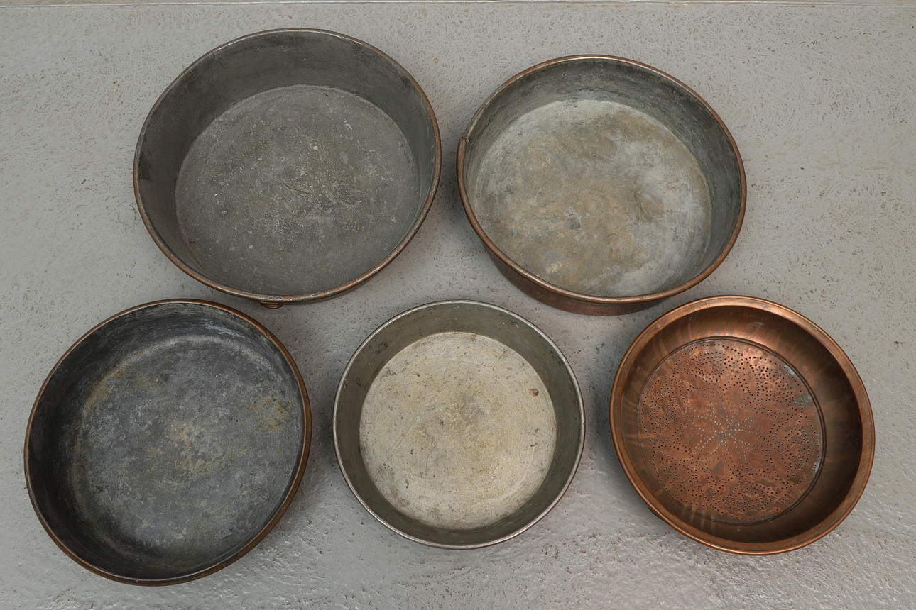 4317140. COPPER OBJECTS, 5 pcs. moulds and strainers, 1800/20th century.