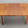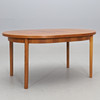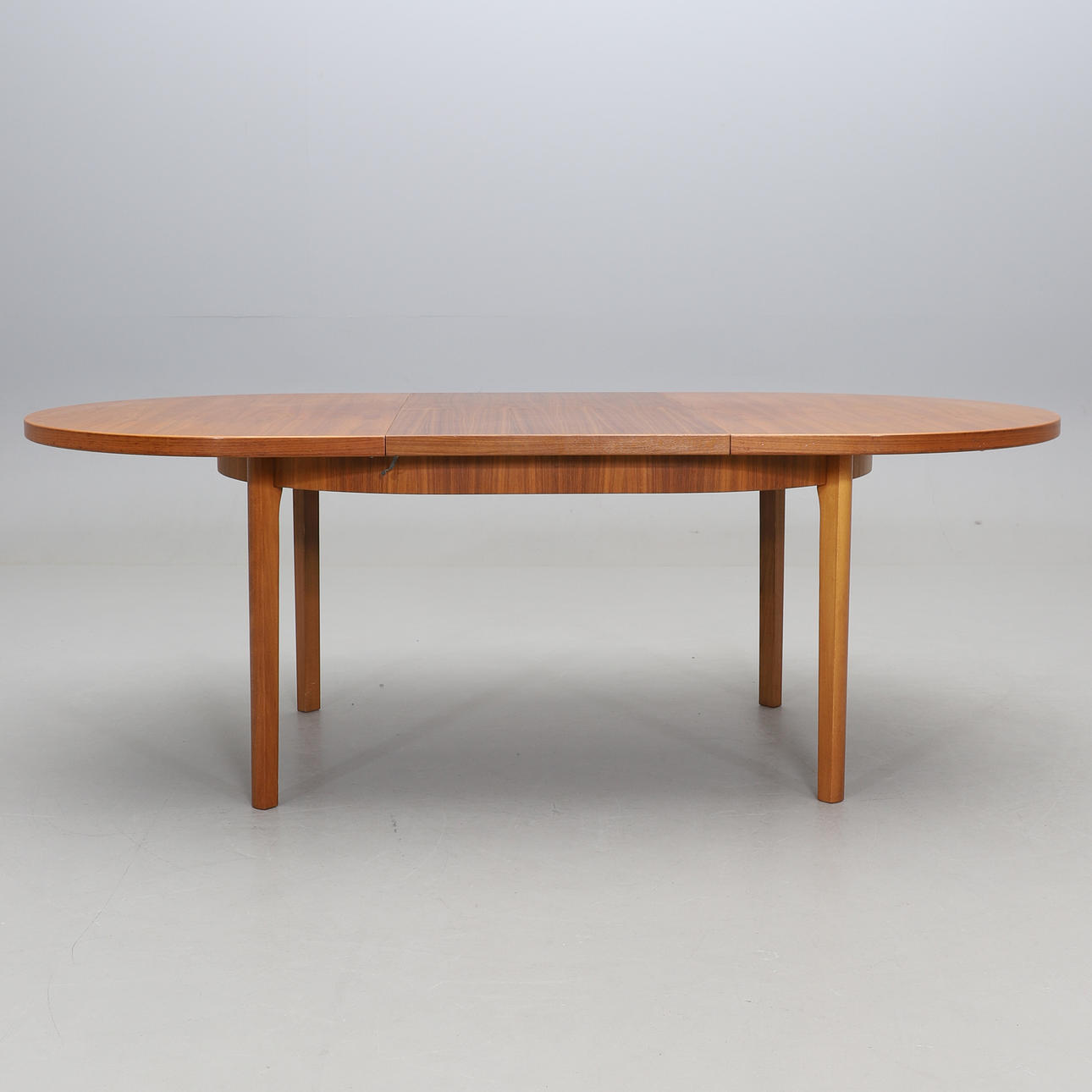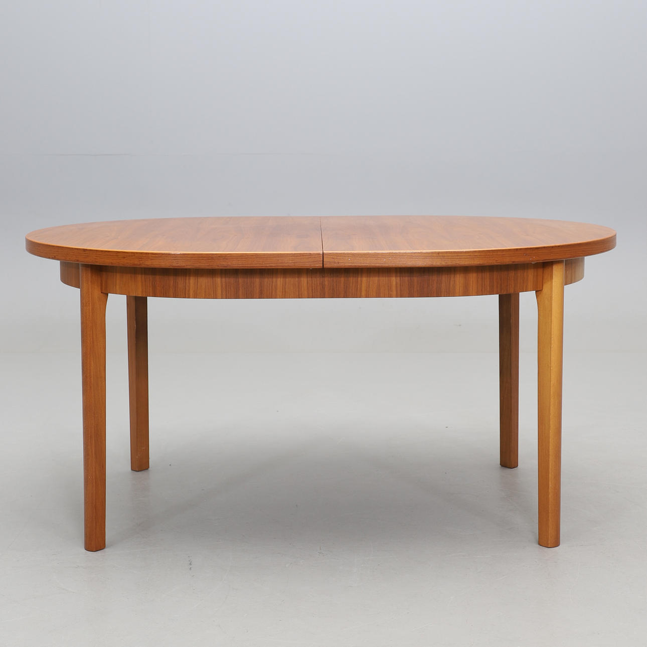 Walnut veneered with beech bones. Elliptical divisible disc, straight legs. A foldable insert plate of 60 cm. Length 150, width 110, height 74 cm.