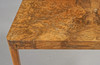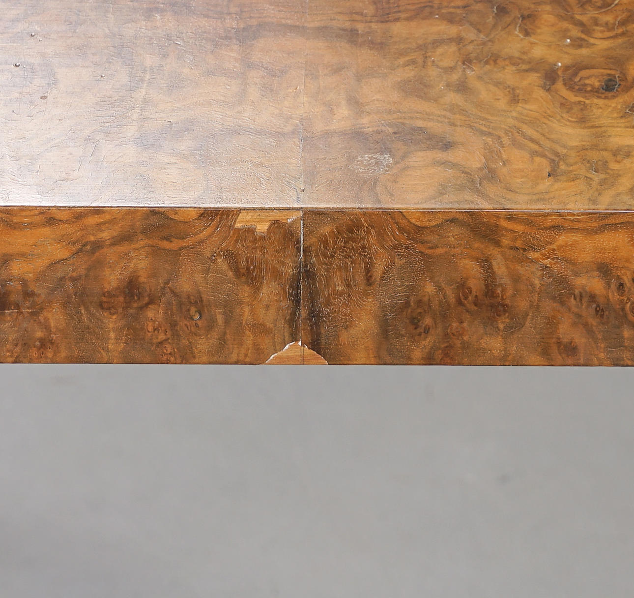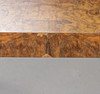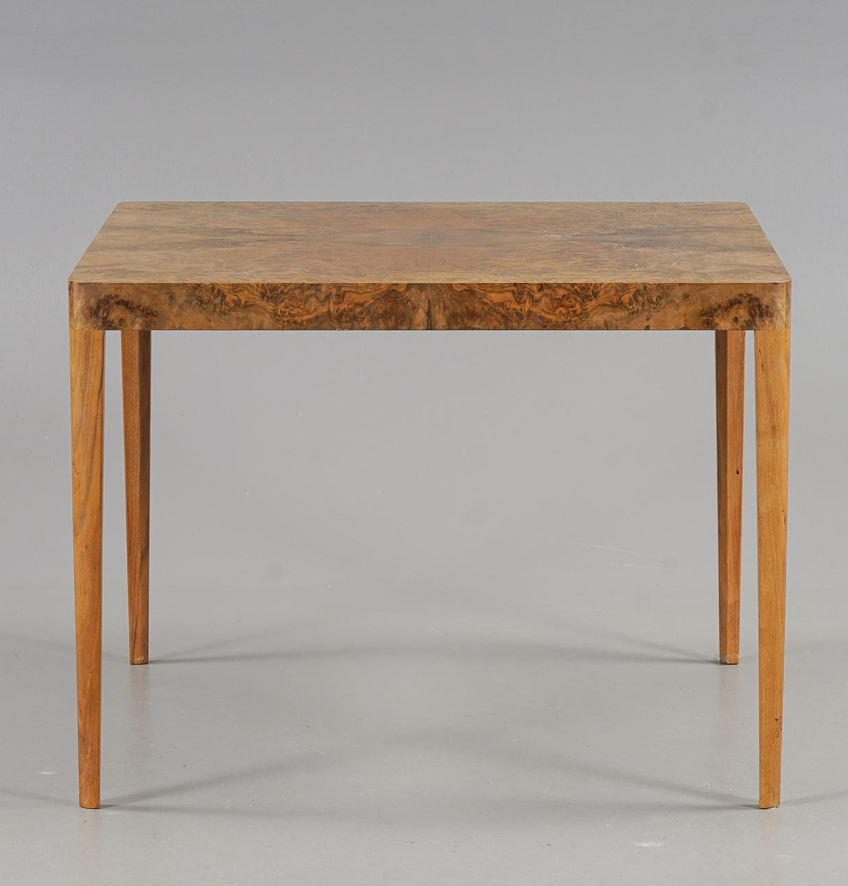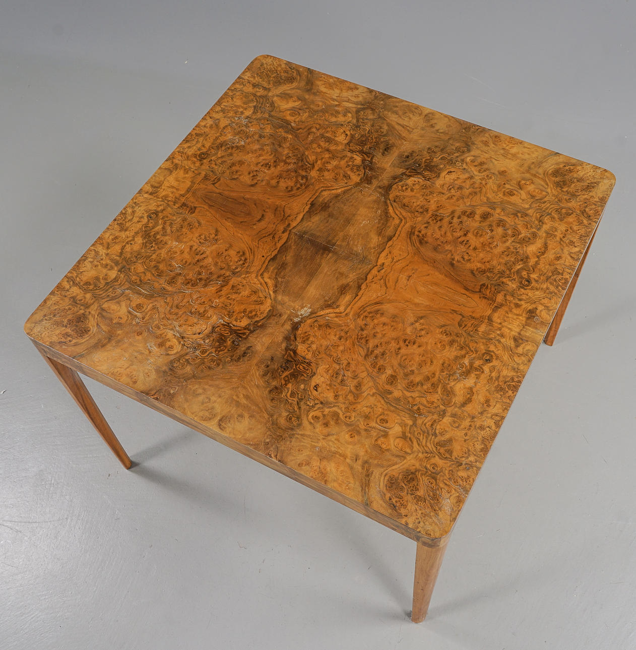 Veneered with walnut root. Square disc with rounded corners.