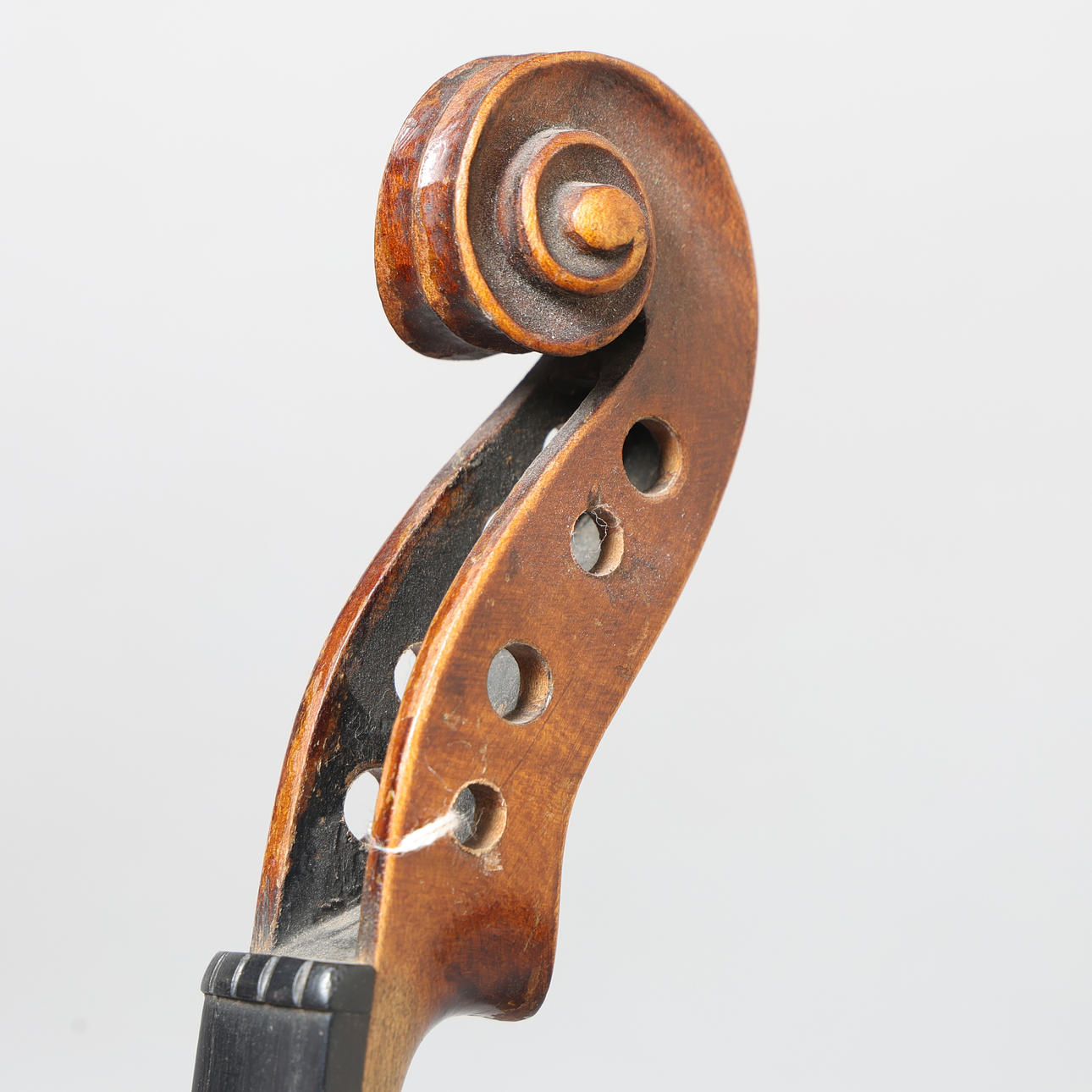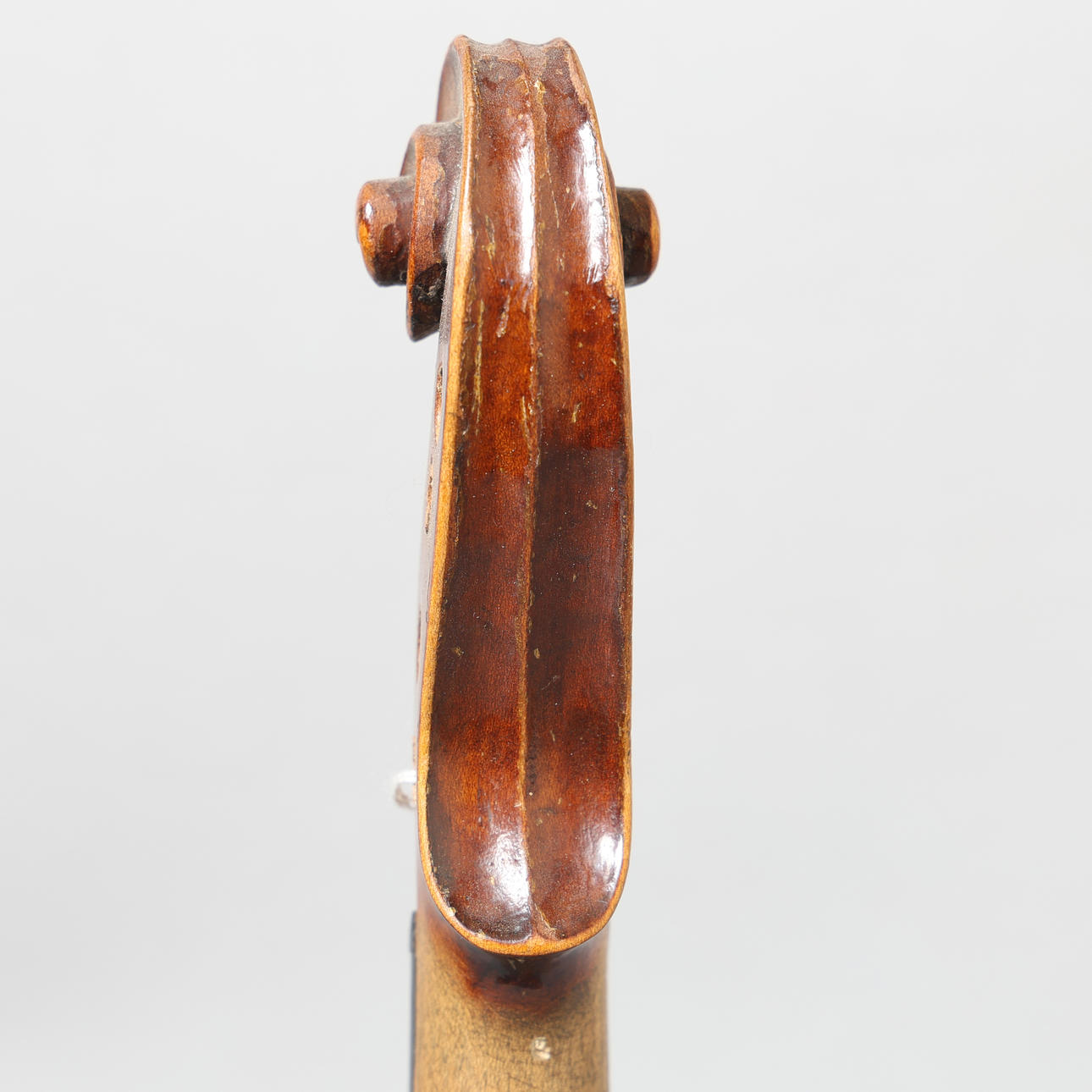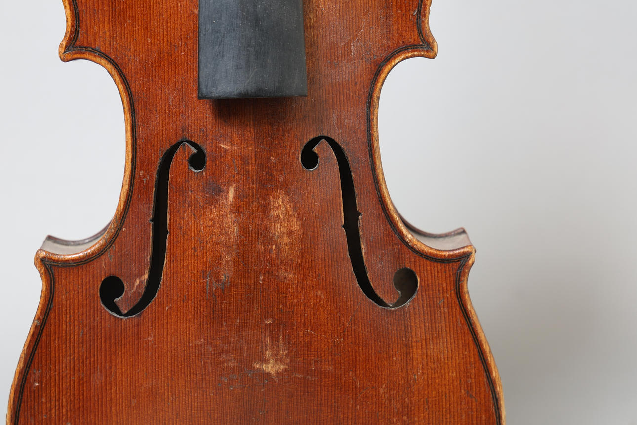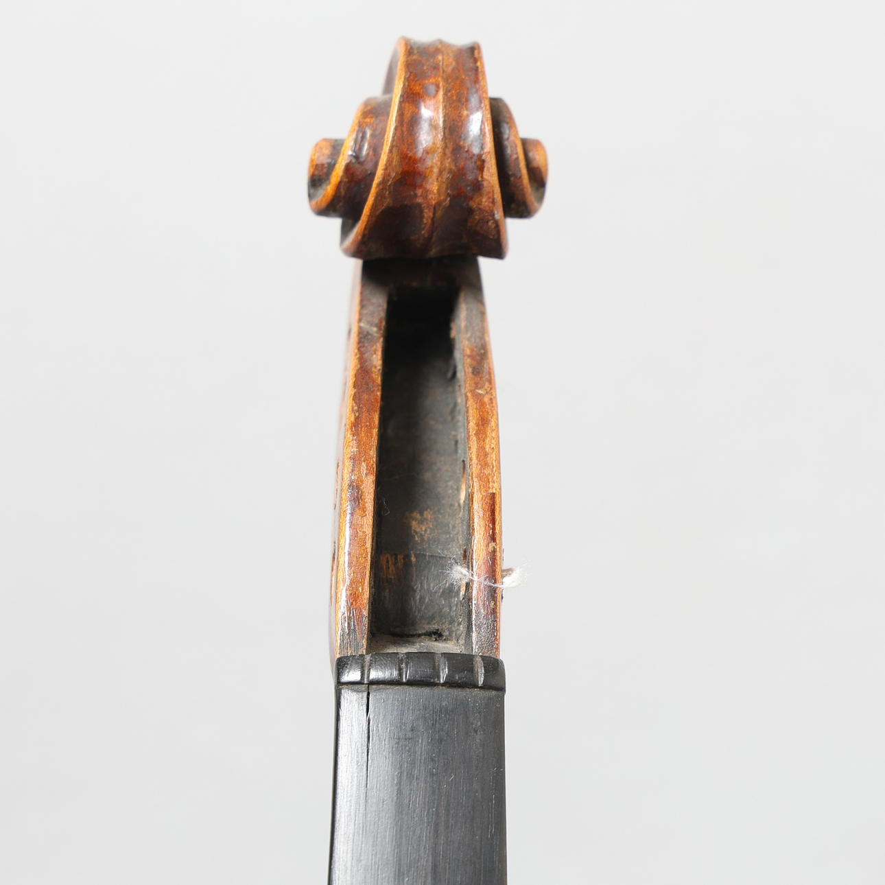 Lacking tuning pegs, strings, bridge, tailpiece and chinrest, with various areas of wear, scuffs, splits and scratches.