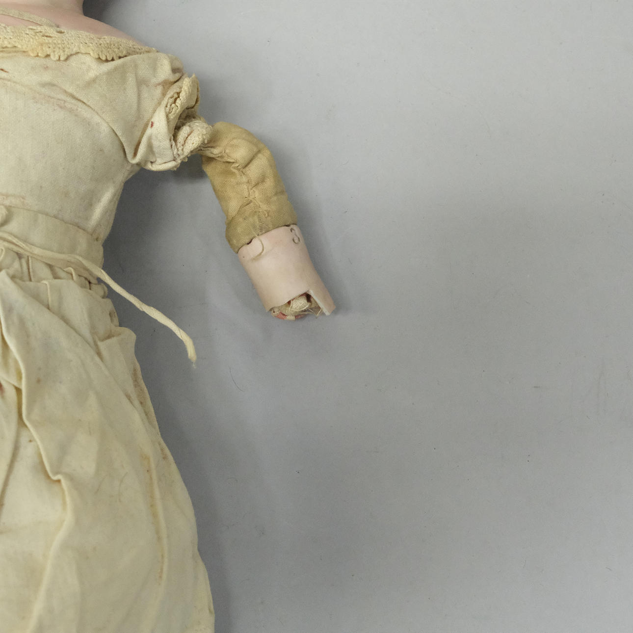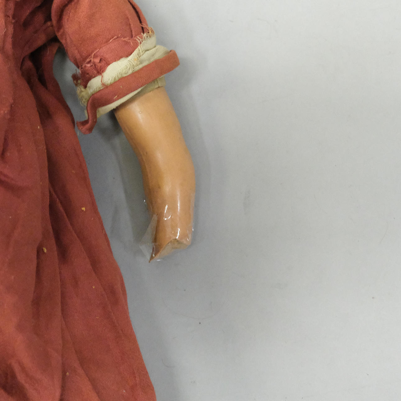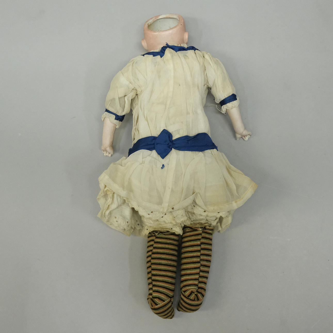 Heads whole, one missing his blindfolded eyes, all with damaged arms, wigs missing, clothes incomplete, dirty.