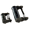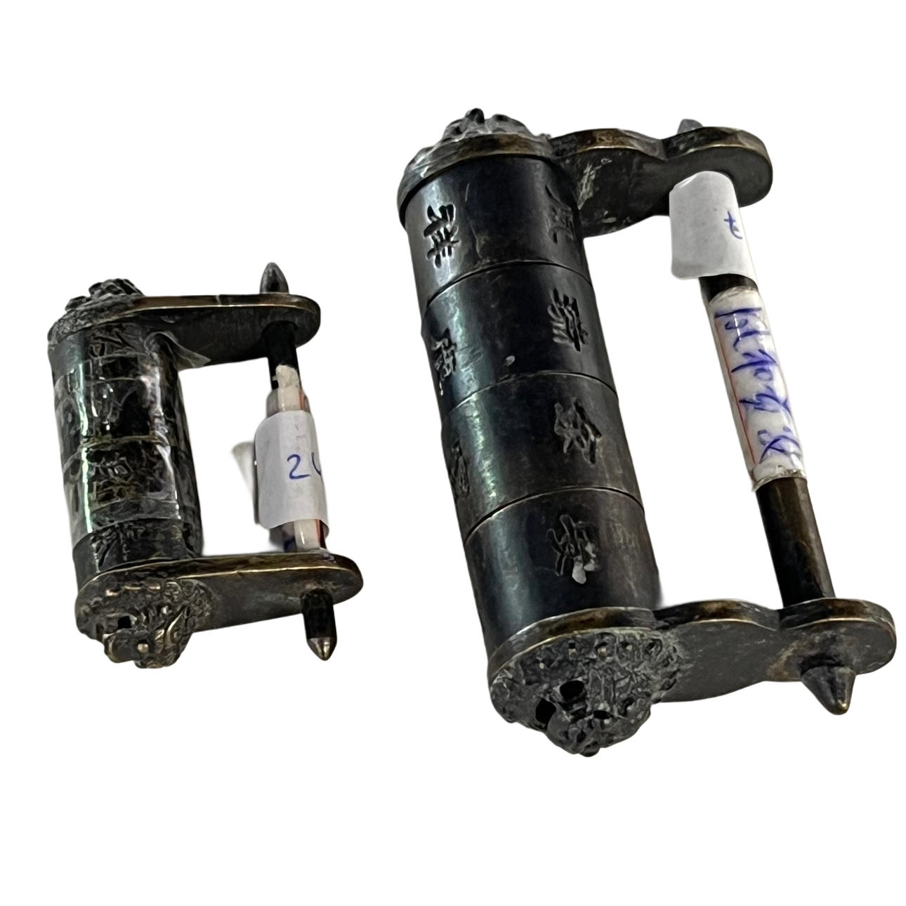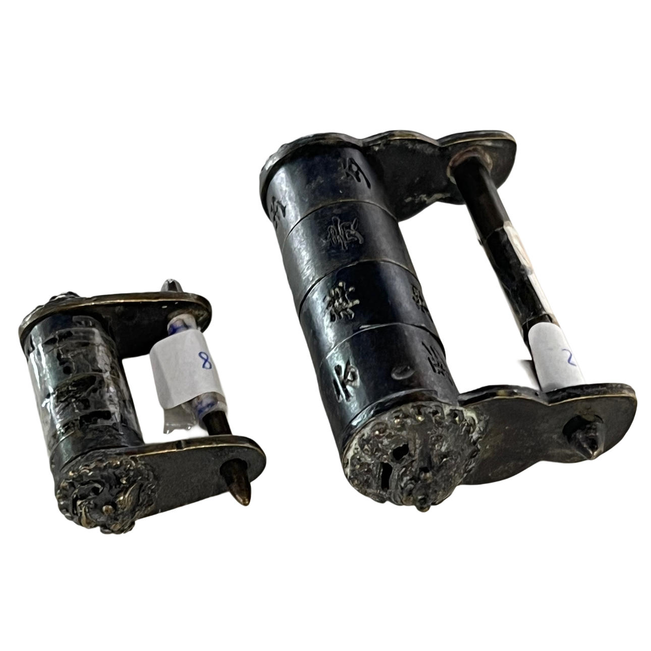 Two Chinese padlocks in patinated bronze.