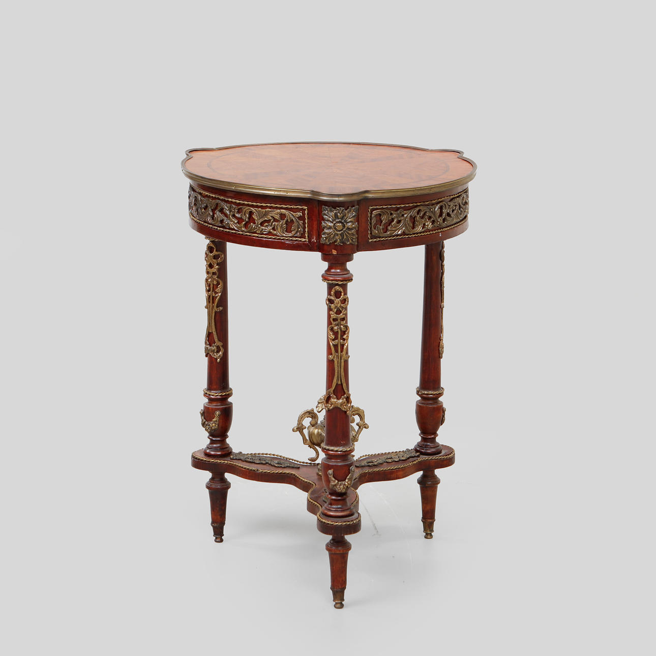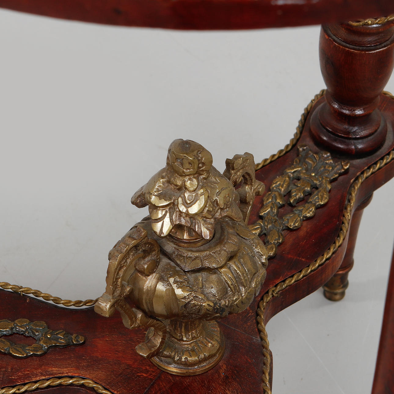 Table top veneered with mahogany. Decor elements made of brass.