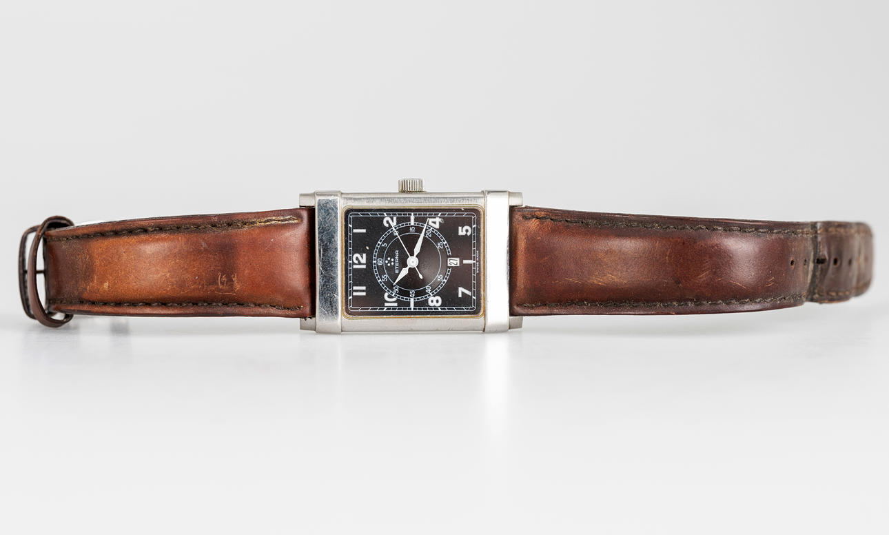 Eterna wristwatch, 'Les Historiques' model. Stainless steel case, black dial with minute, hour and second hand, date at '6' clock. Leather strap with pin buckle Automatic movement. Dimensions approx. 25mm x 41mm The caseback is engraved with “Michael 26.06.2000”. Box not from Eterna. The clock was ticking at the time of the review, Stockholm's auction shop does not guarantee functionality.