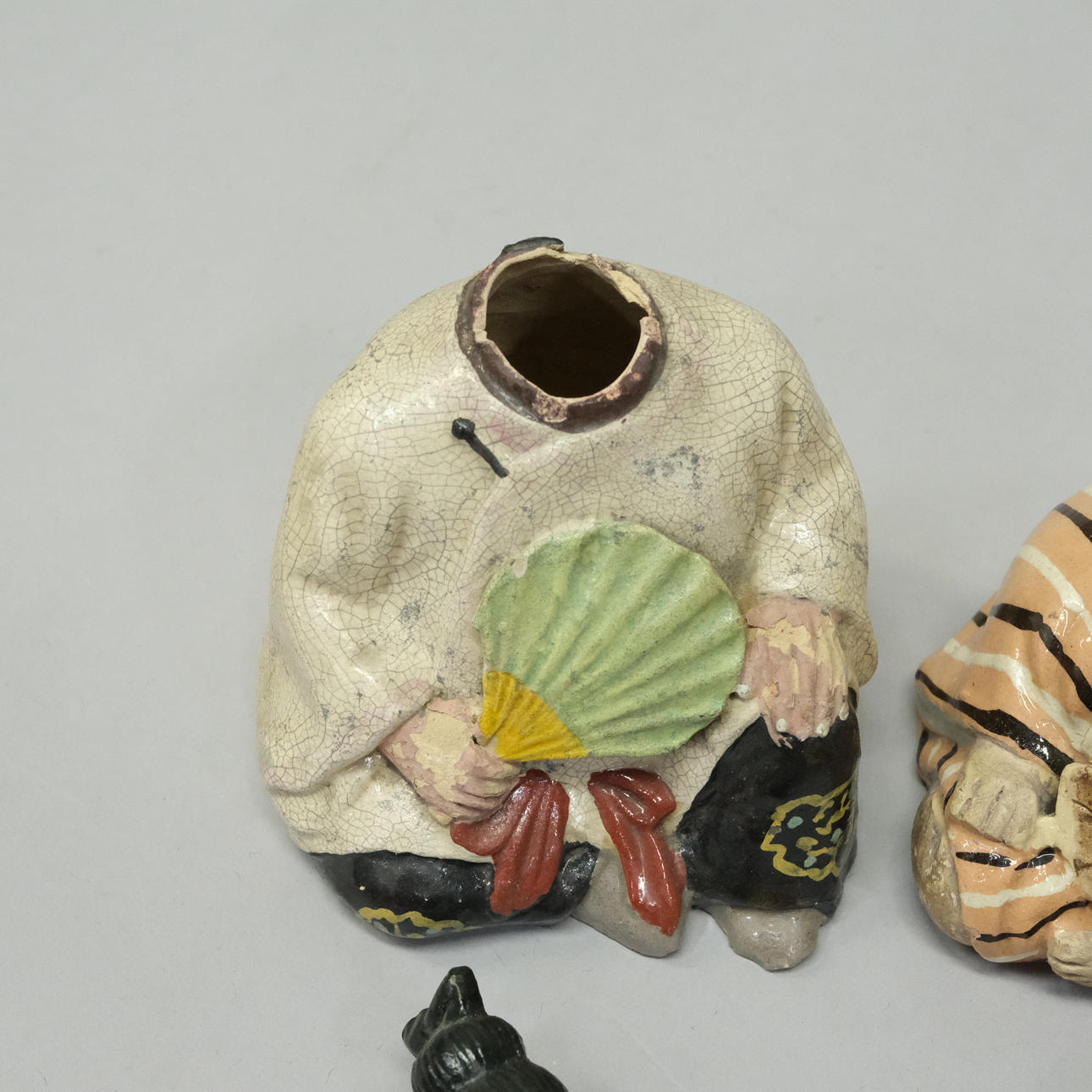 Abrasions, largest figure with cracks and chips on neck collar, hat figure with damaged hat.