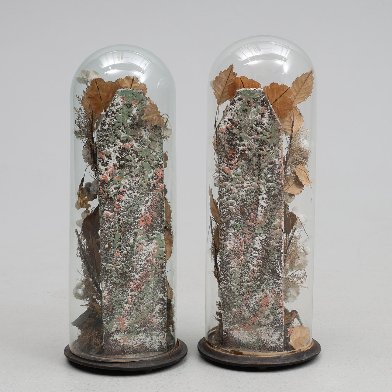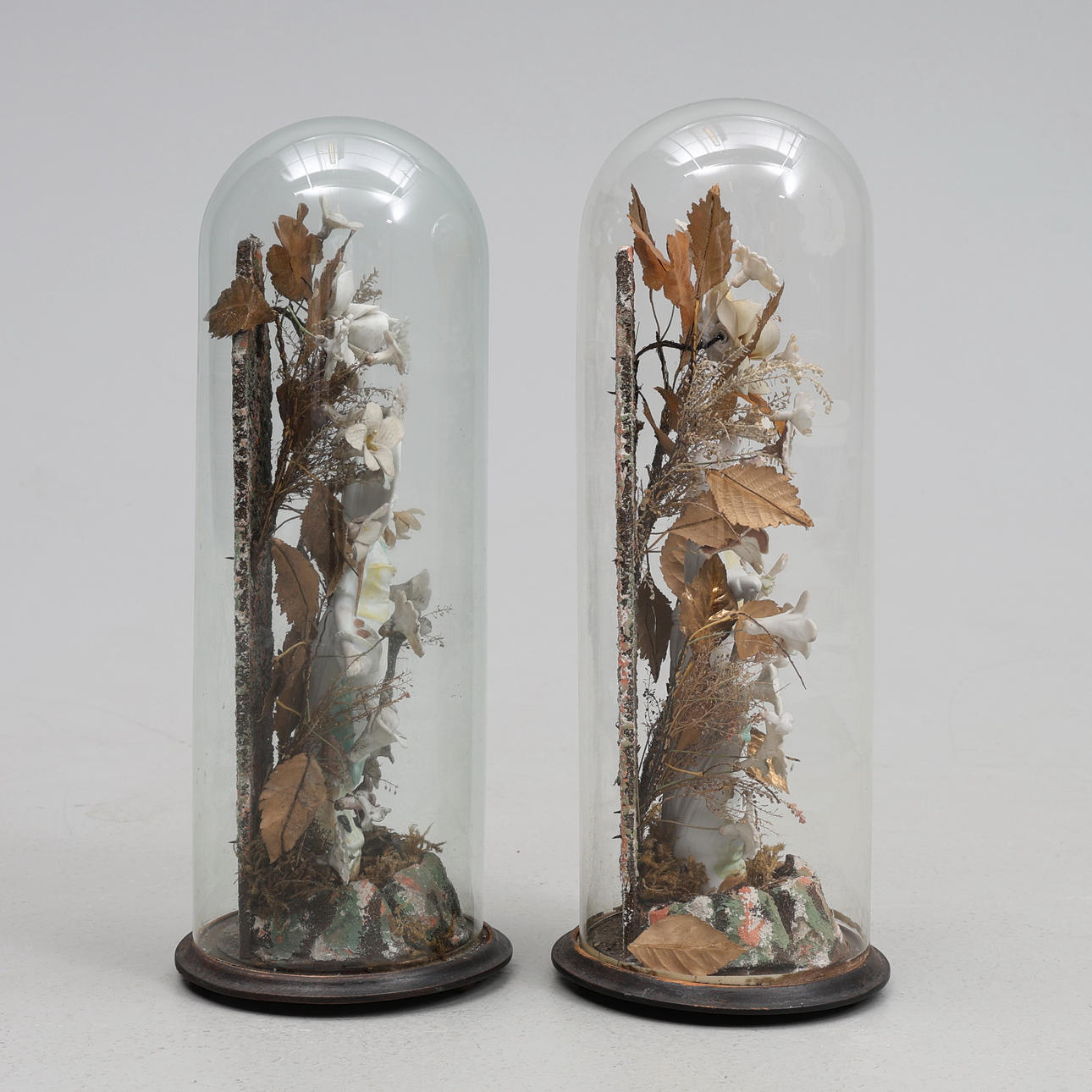 4320995. 2 GLASS DOMES WITH PORCELAIN FIGURINES.