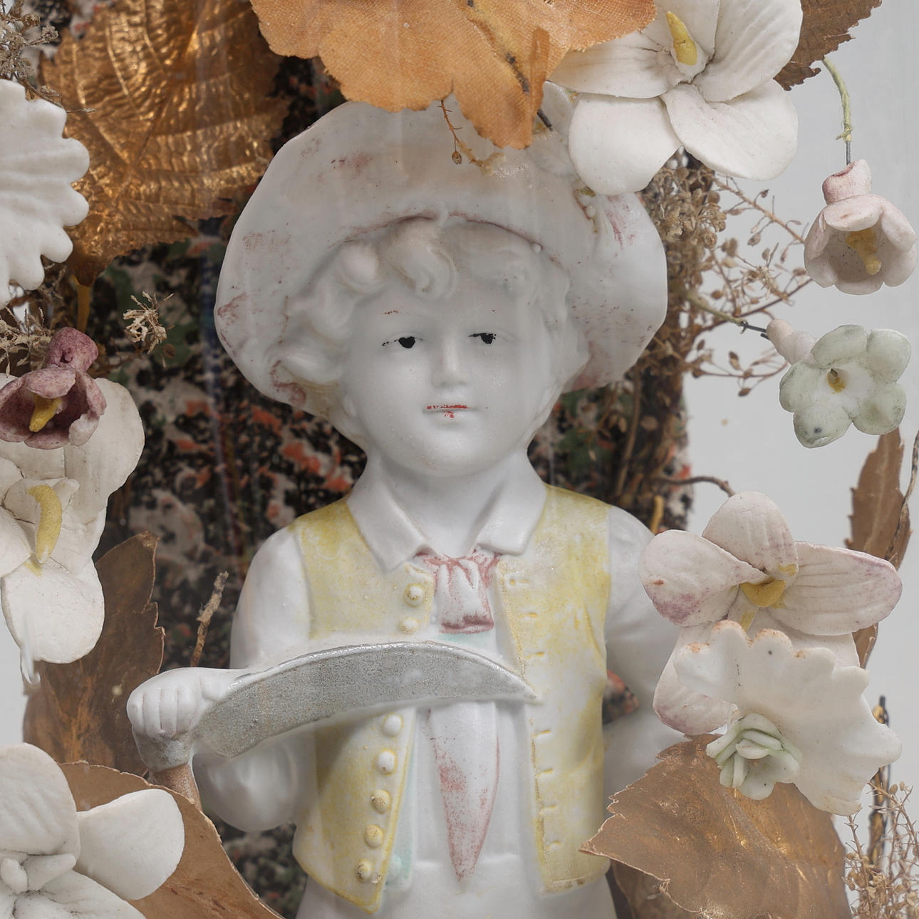2 GLASS DOMES WITH PORCELAIN FIGURINES.