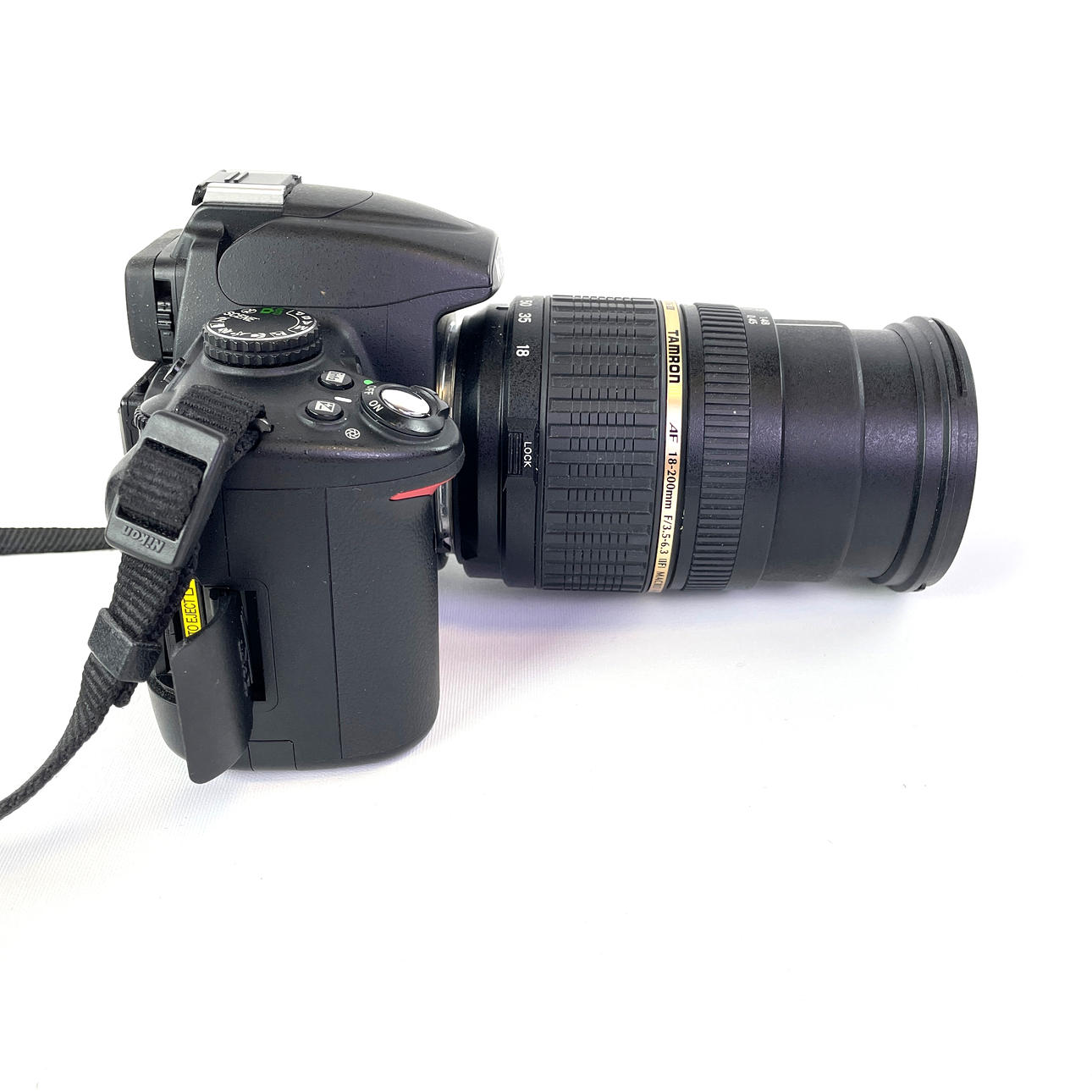 Nikon D5000 with lens Tamron AF 18-200mm F/3.5-6.3 (IF) Macro 62 A14. Charger Nikon with cord. Bag size 20 x 24 x 17 cm.