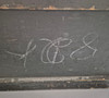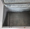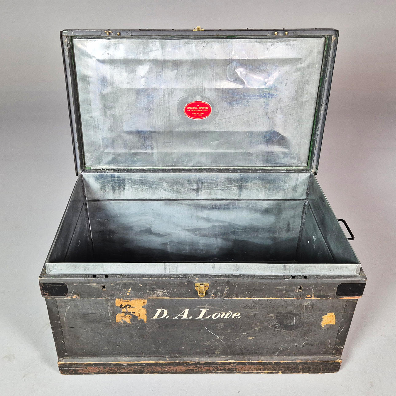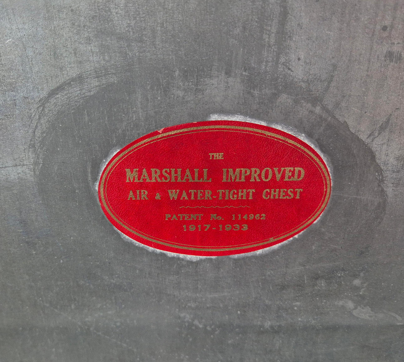 grey painted, metal bound and zinc lined, labelled the Marshall improved air and water tight chest, 50cm H x 91cm x 53cm.