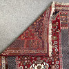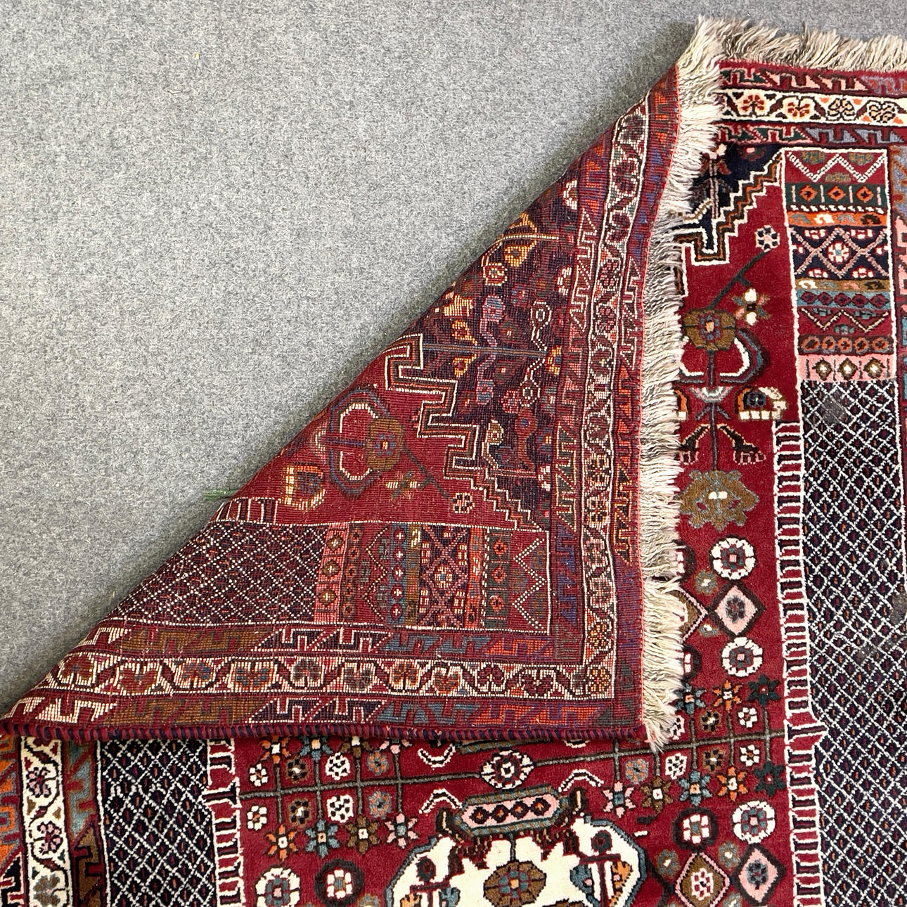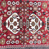 Handmade oriental rug, geometric pattern and flowers in polychrome colors against red background. Approx dimensions: 165 x 116 cm.