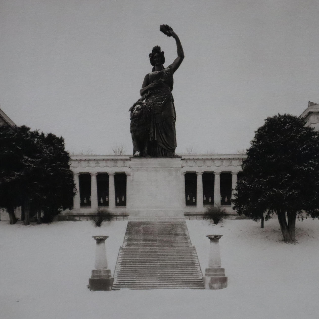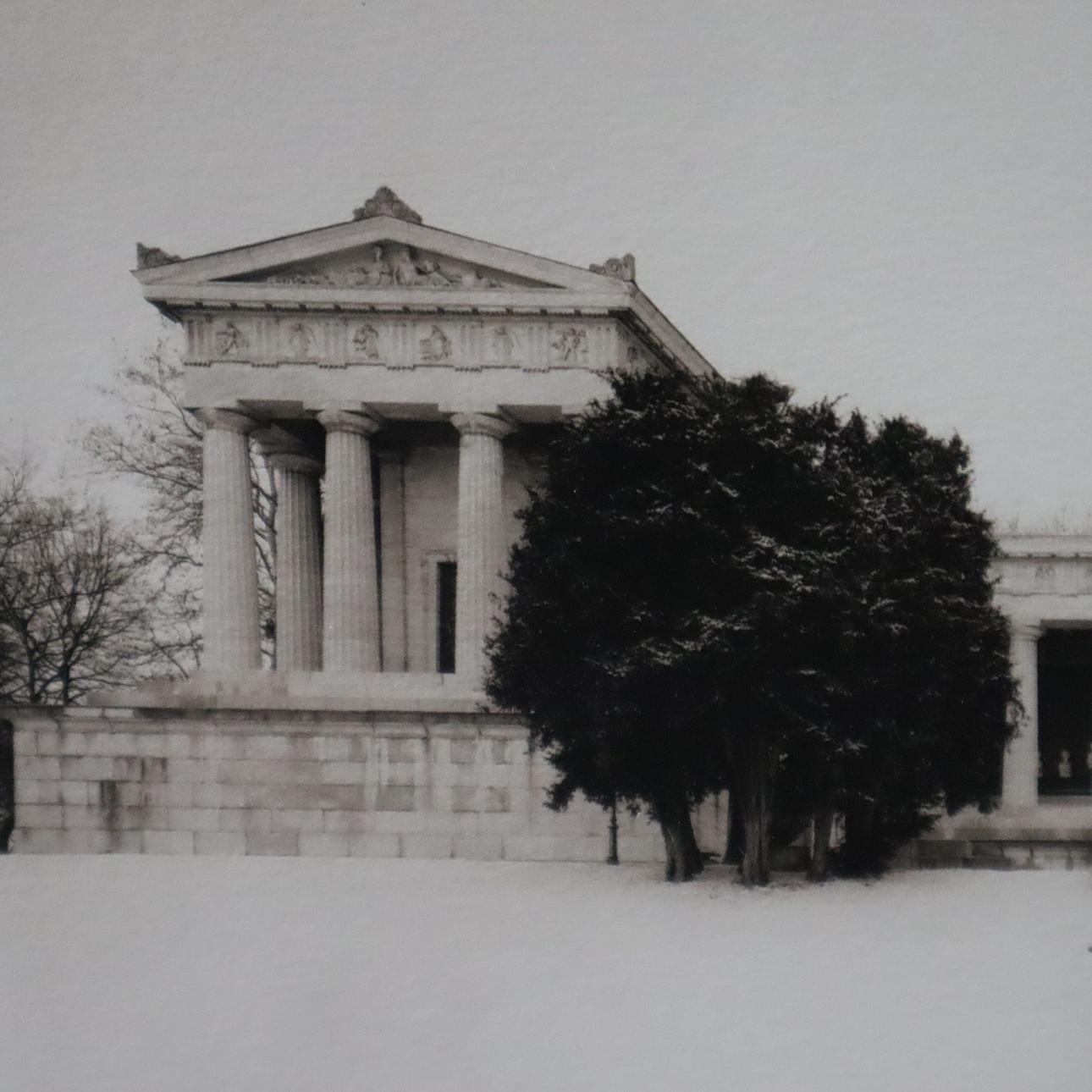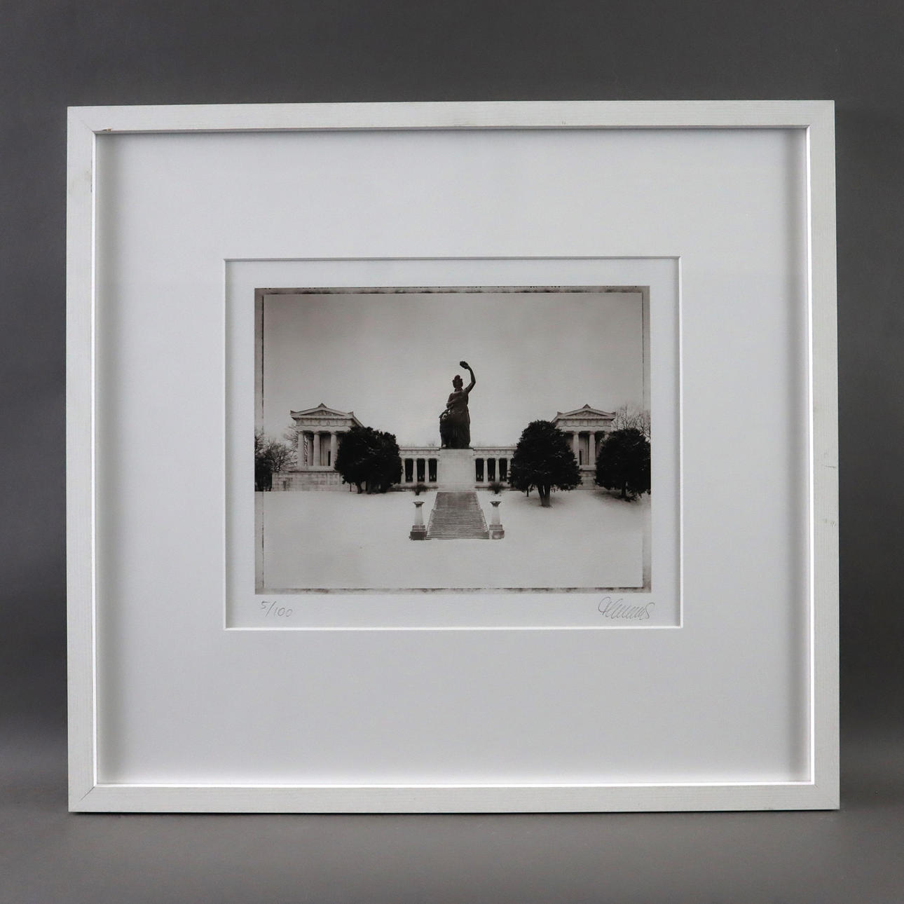 Motif from the series “Munich Elegies”, black and white print on handmade paper, signed by hand, edition 5/100, image size: 22 x 28.5 cm, framed in a passe-partout under glass, frame size: 51.5 x 55 cm