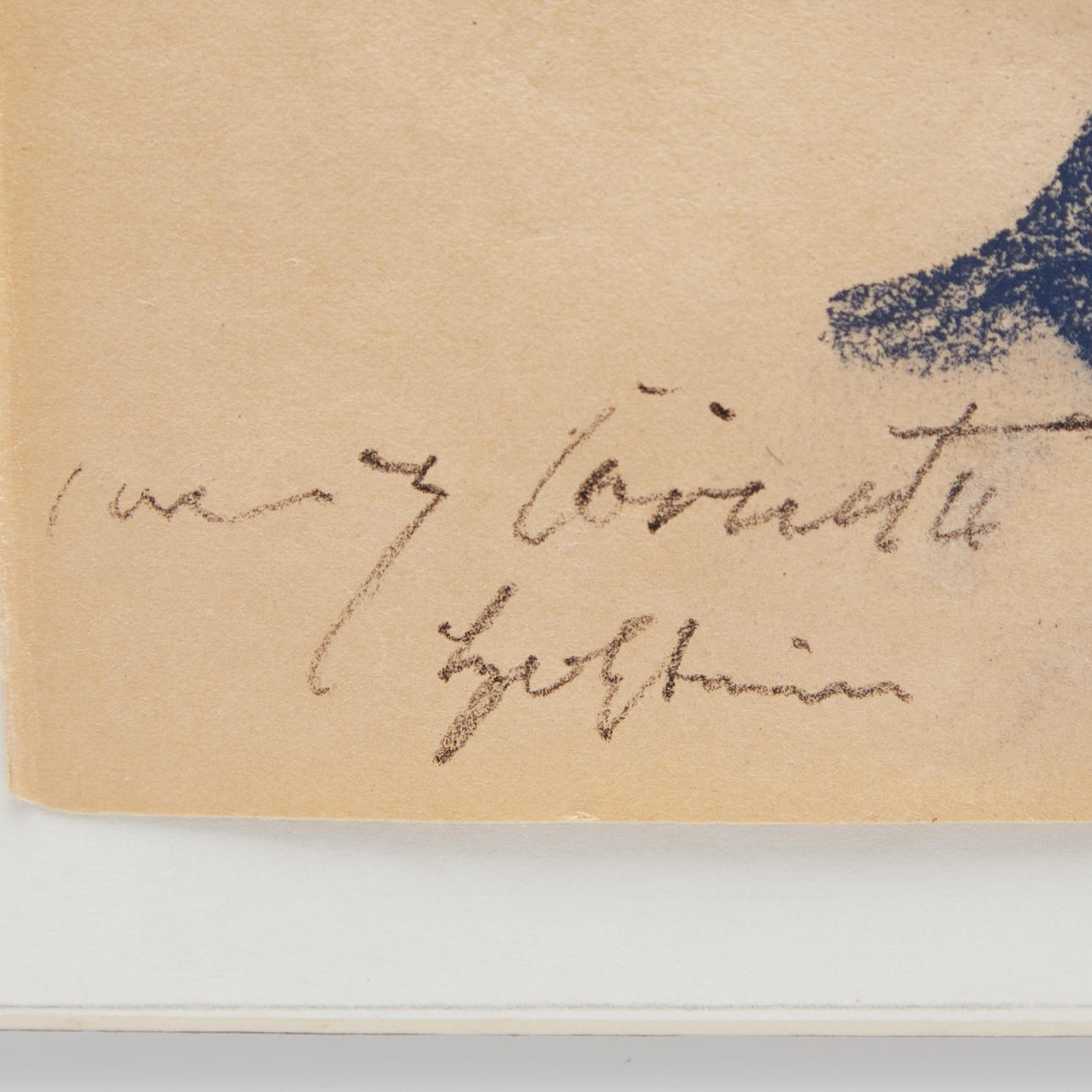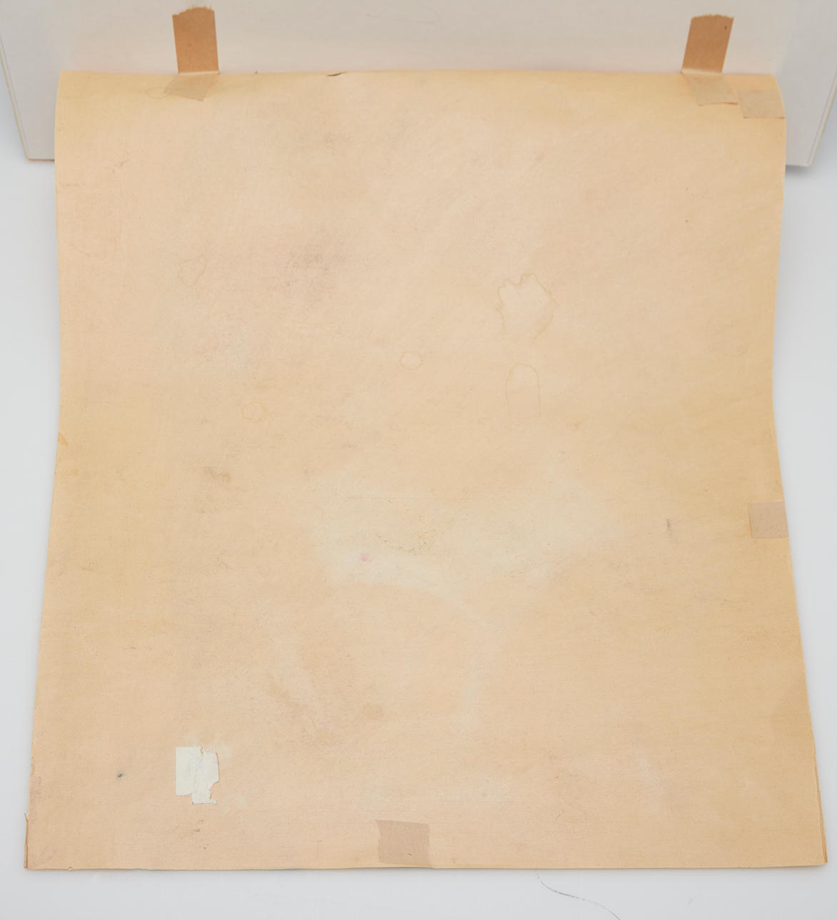 Sheet darkened and light-edged, leaf edge slightly damaged, minimally creased, sporadic water spots, various adhesive residues on the back.