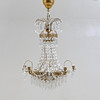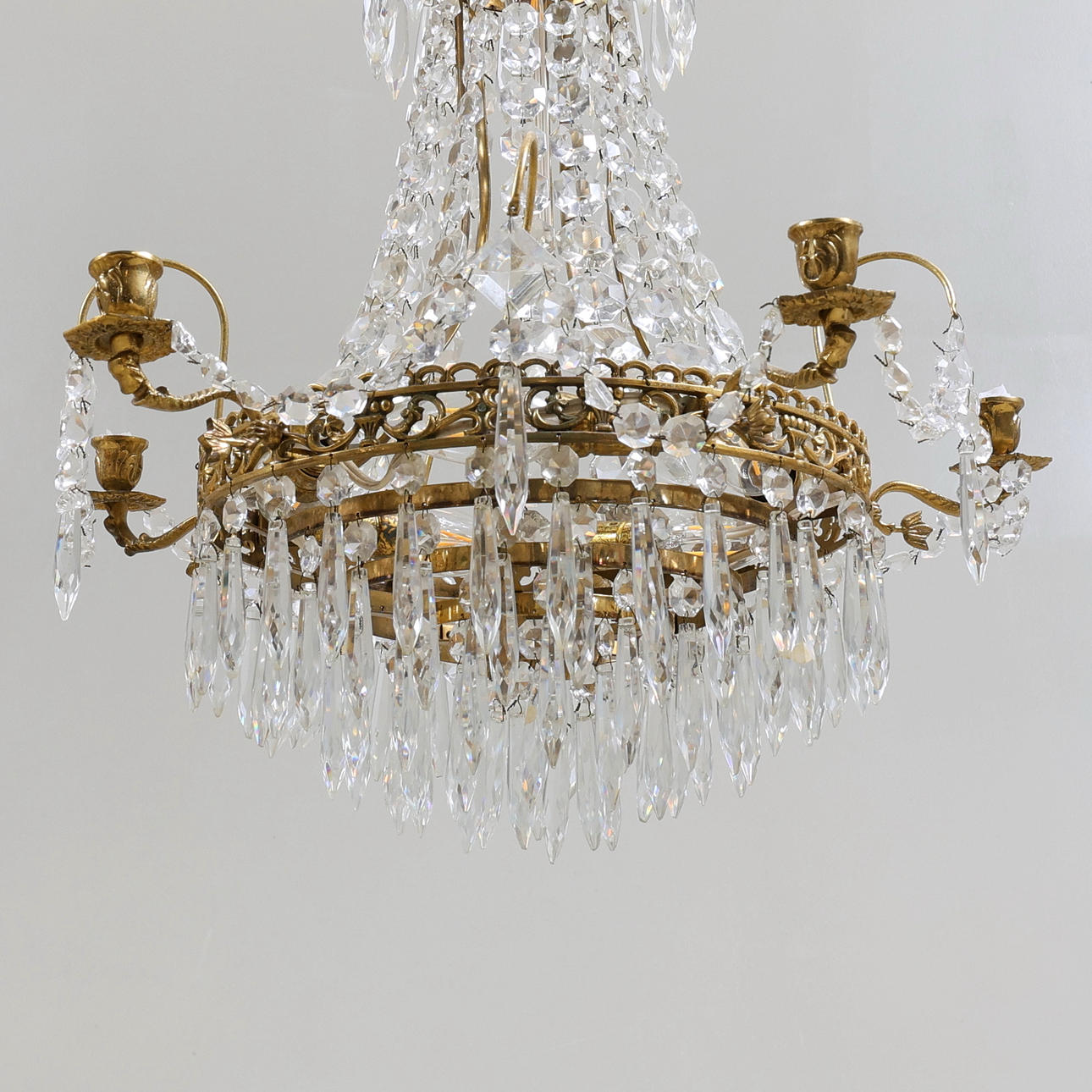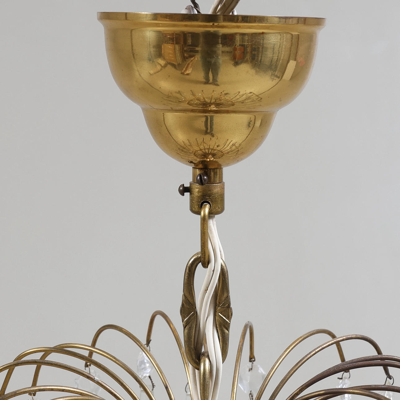 Chandelier with brass frame, framed with prisms, five light arms and one bright spot Diameter 46, height 58 cm excluding suspension.