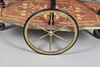 with foliate inlaid decoration and pierced brass gallery, all raised on two large spoked wheels and a smaller wheel, 77cm x 46cm x 74cm high.