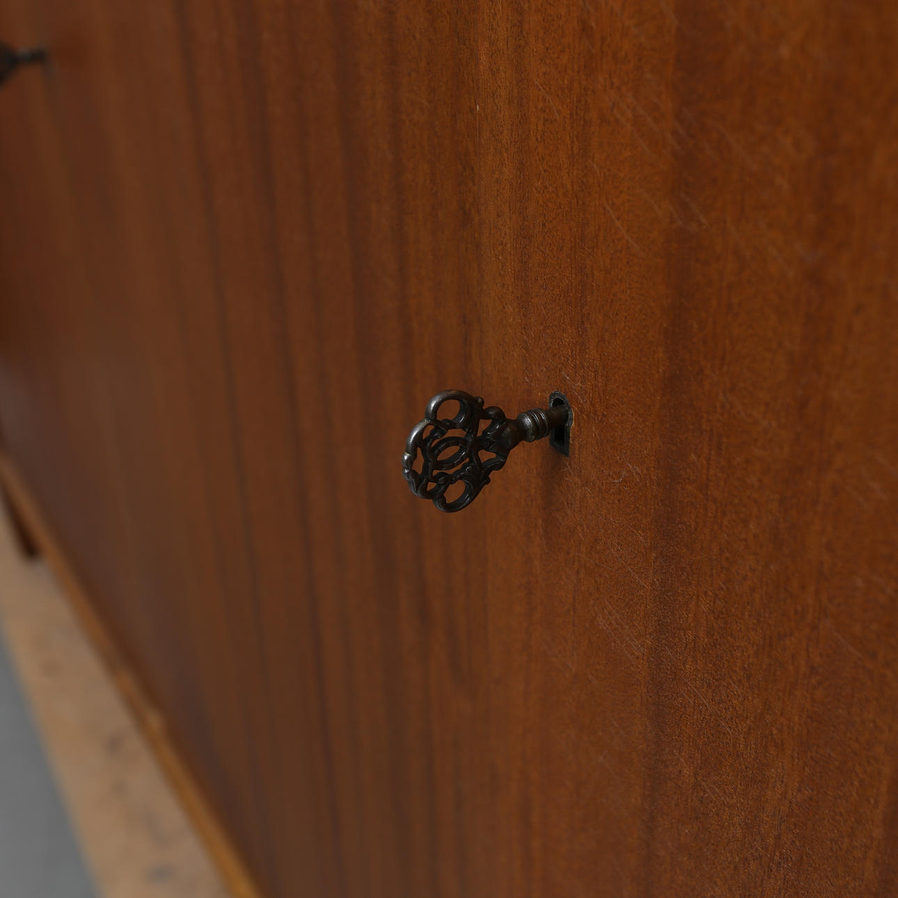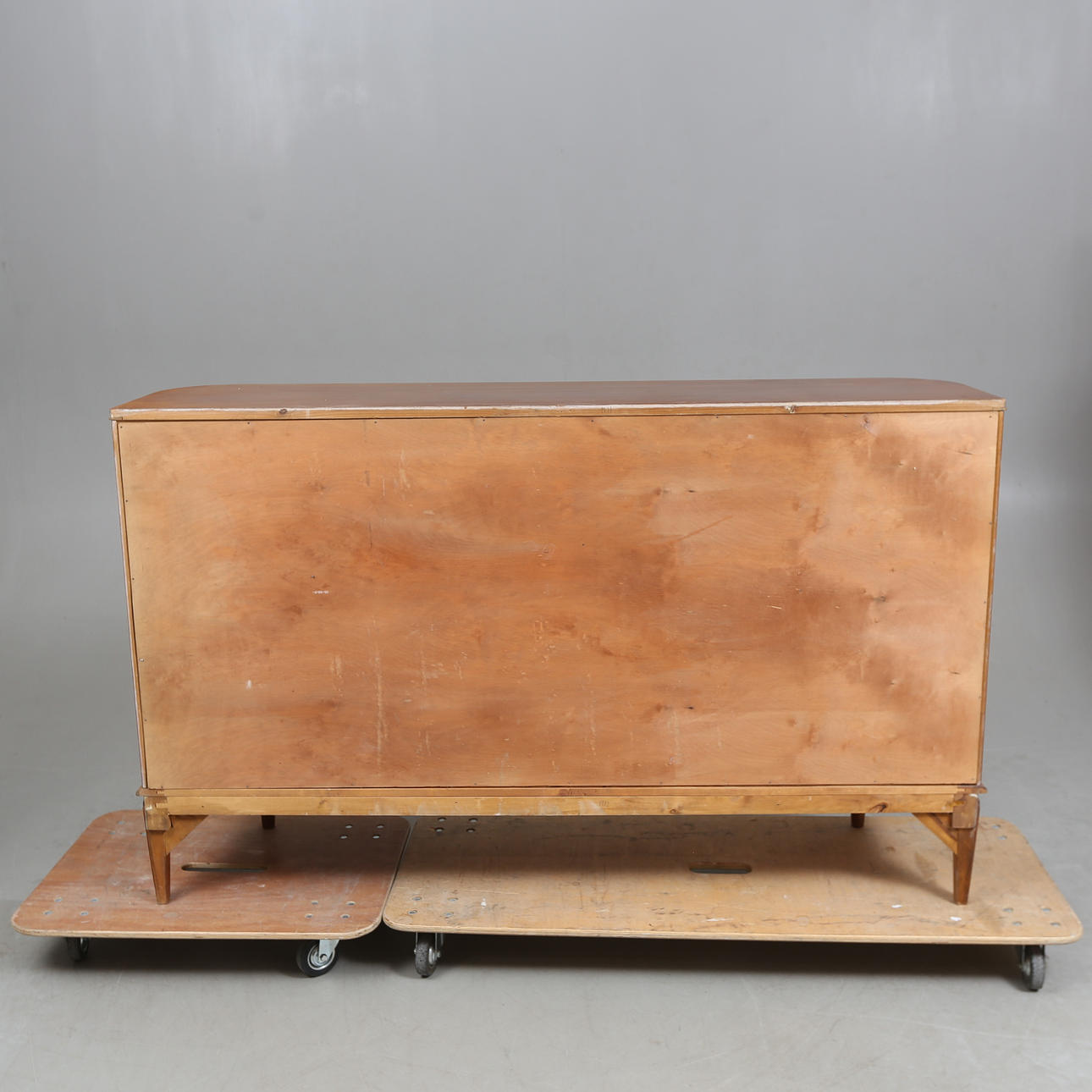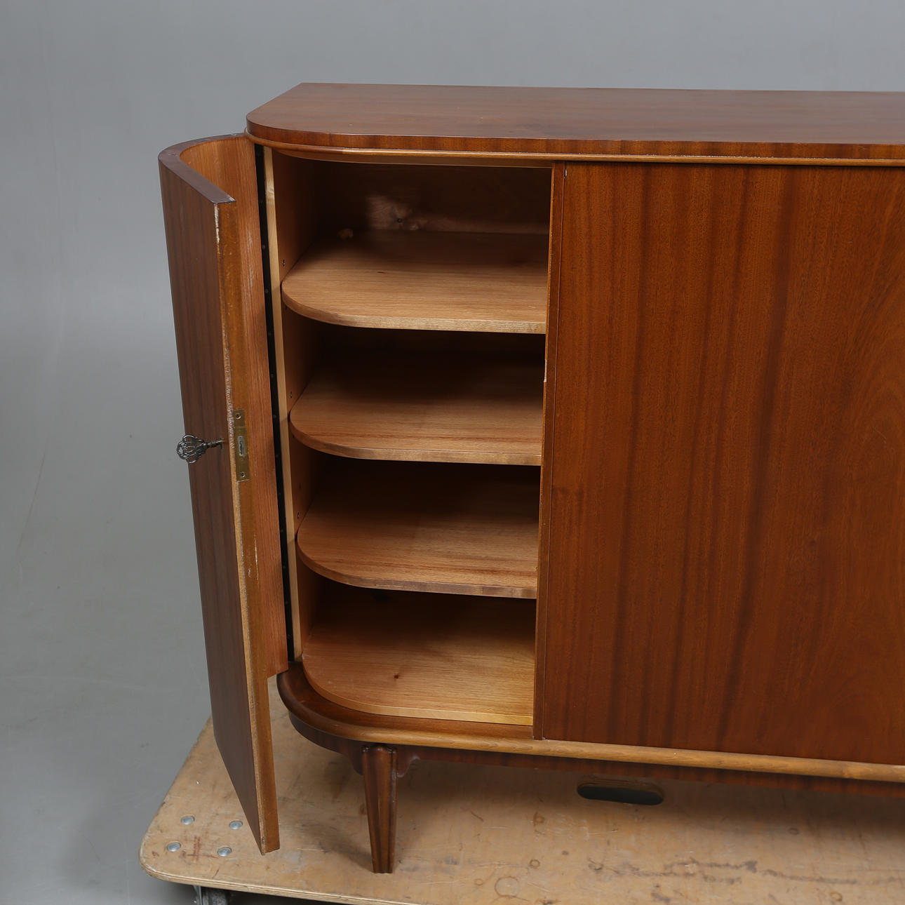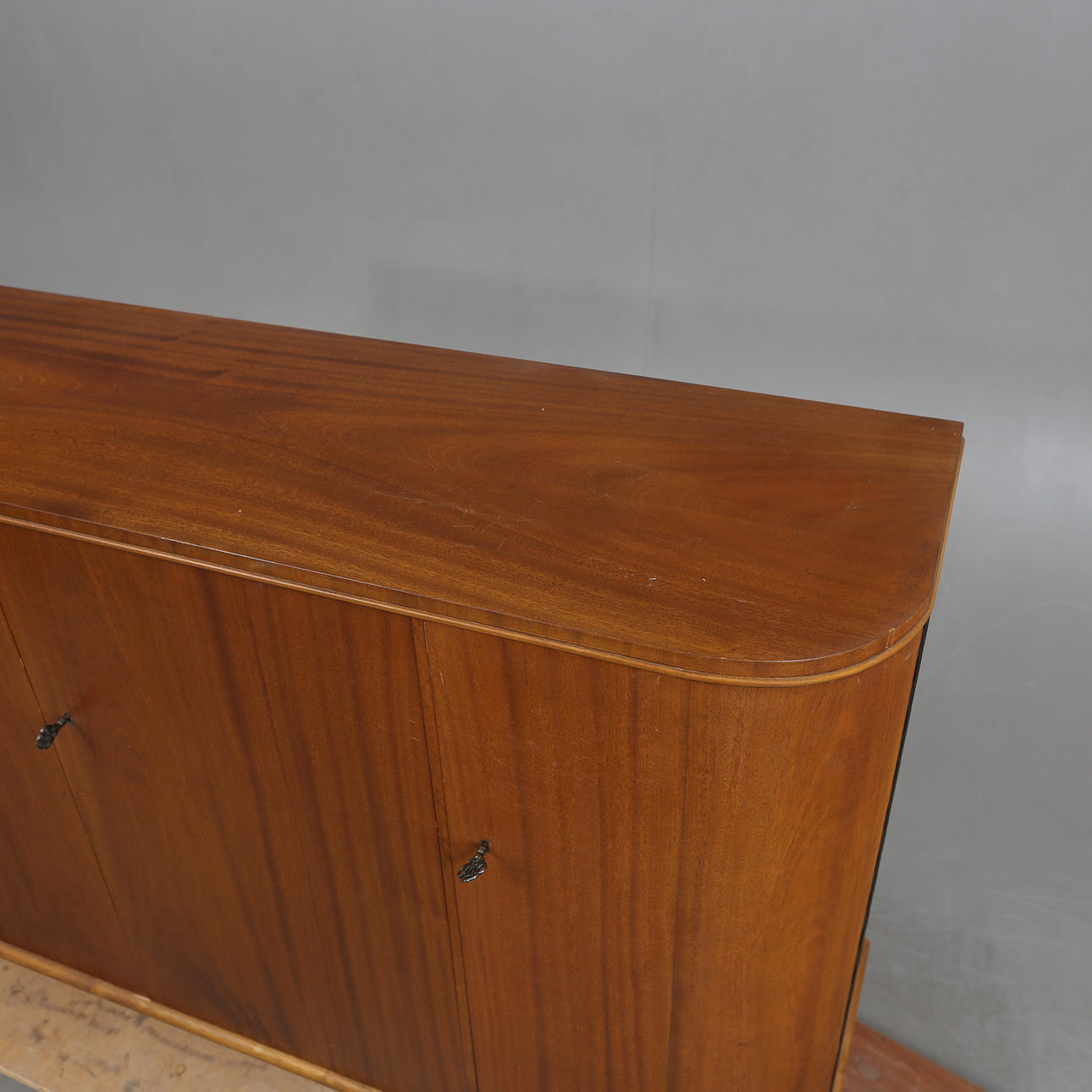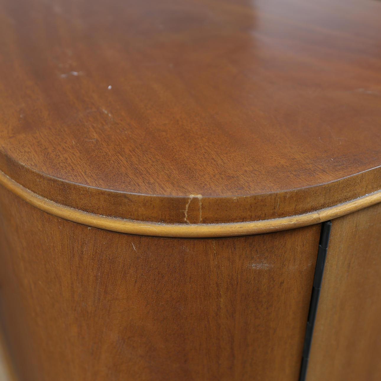 Minor veneer damages/repairs, scratches or impact marks, stains. Side doors slightly skewed.