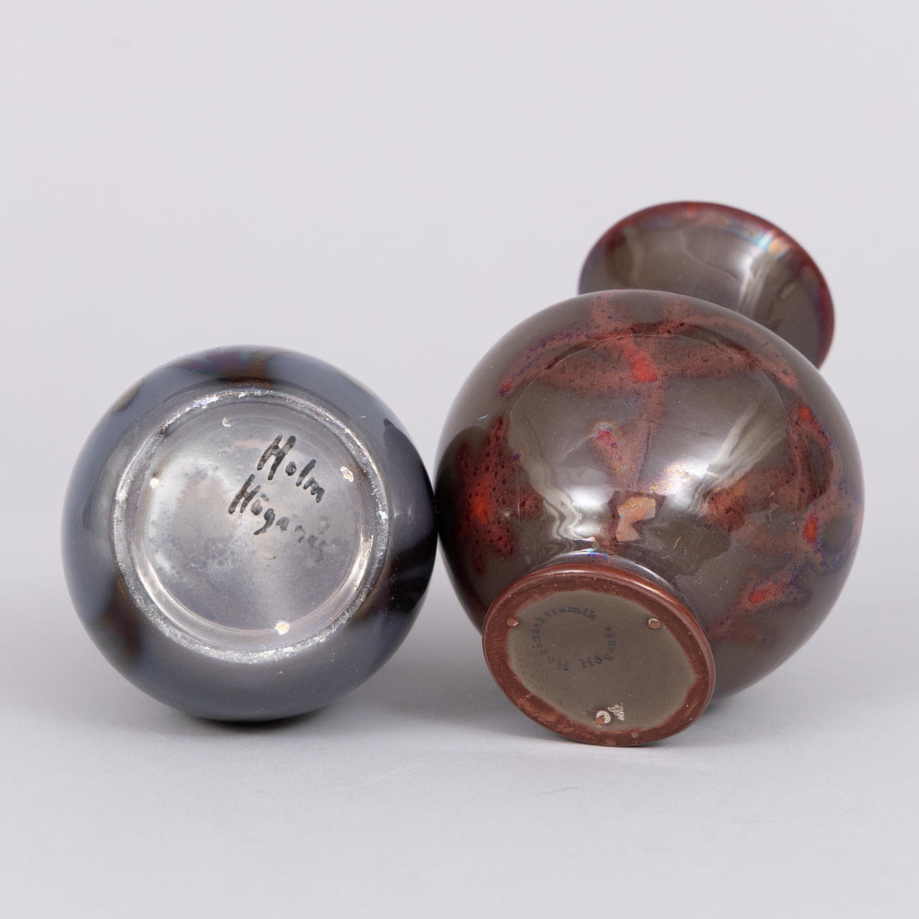 Two vases in earthenware with luster glaze, one vase signed Holm, height of both vases 15 cm.