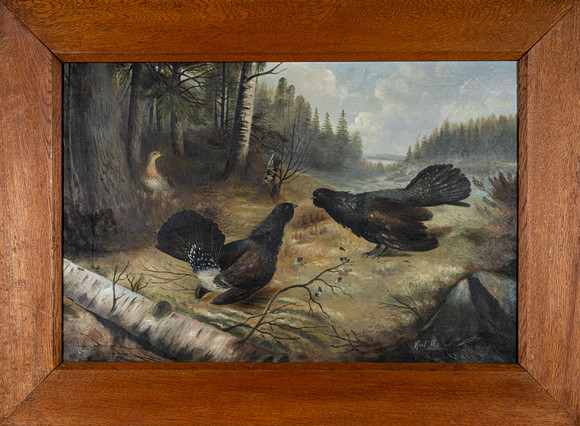 4326156. MOSSE STOOPENDAAL. Capercaillie with two females, oil on canvas, signed and dated 1933.