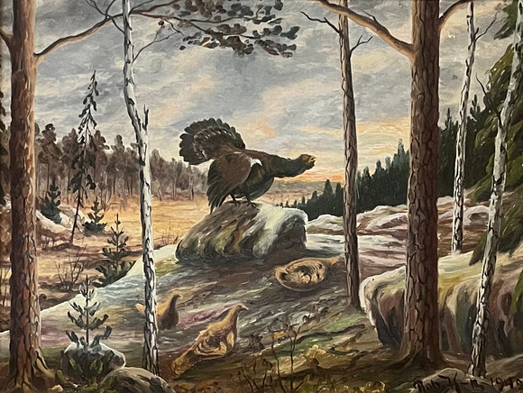 MOSSE STOOPENDAAL. Capercaillie with two females, oil on canvas, signed and dated 1933.