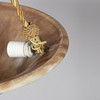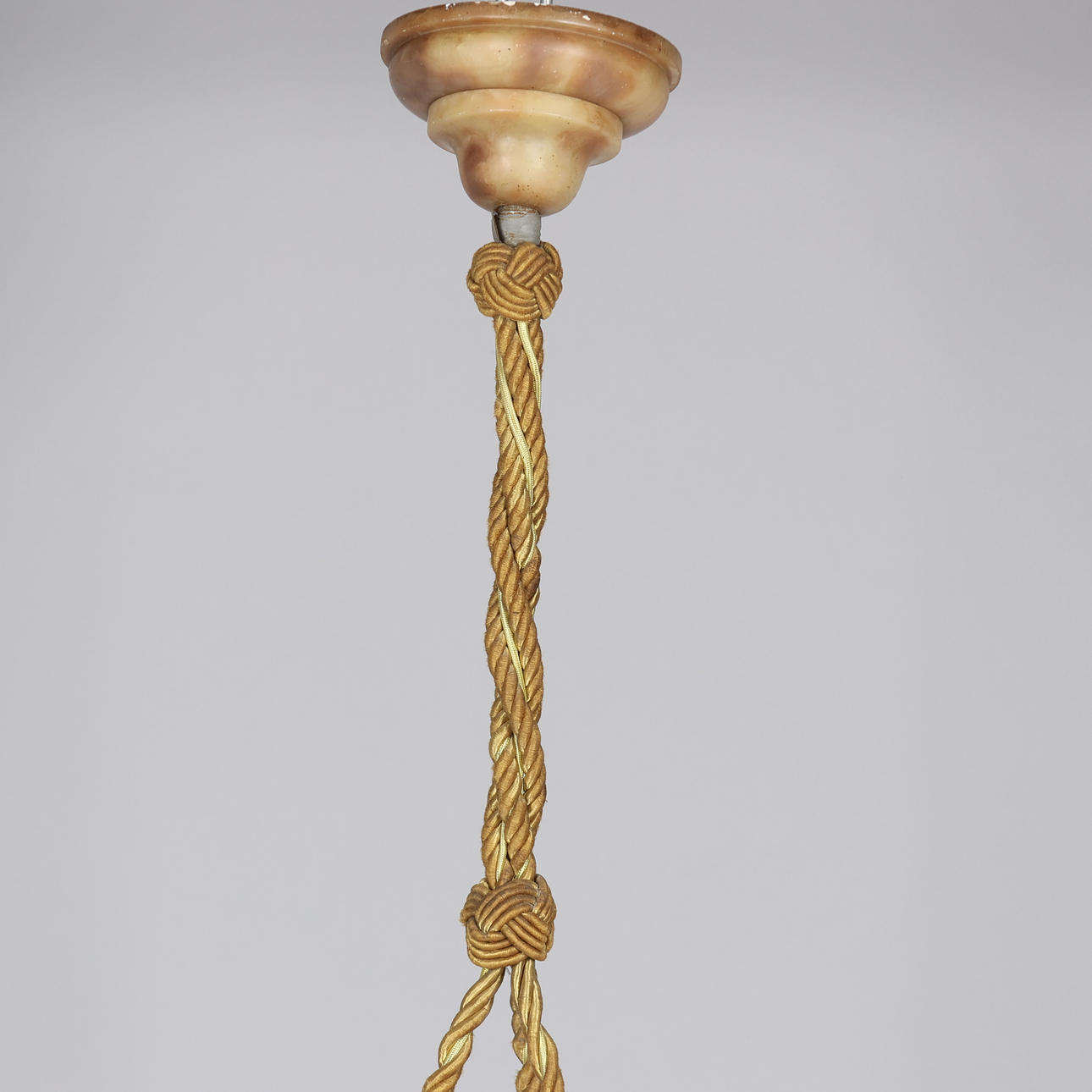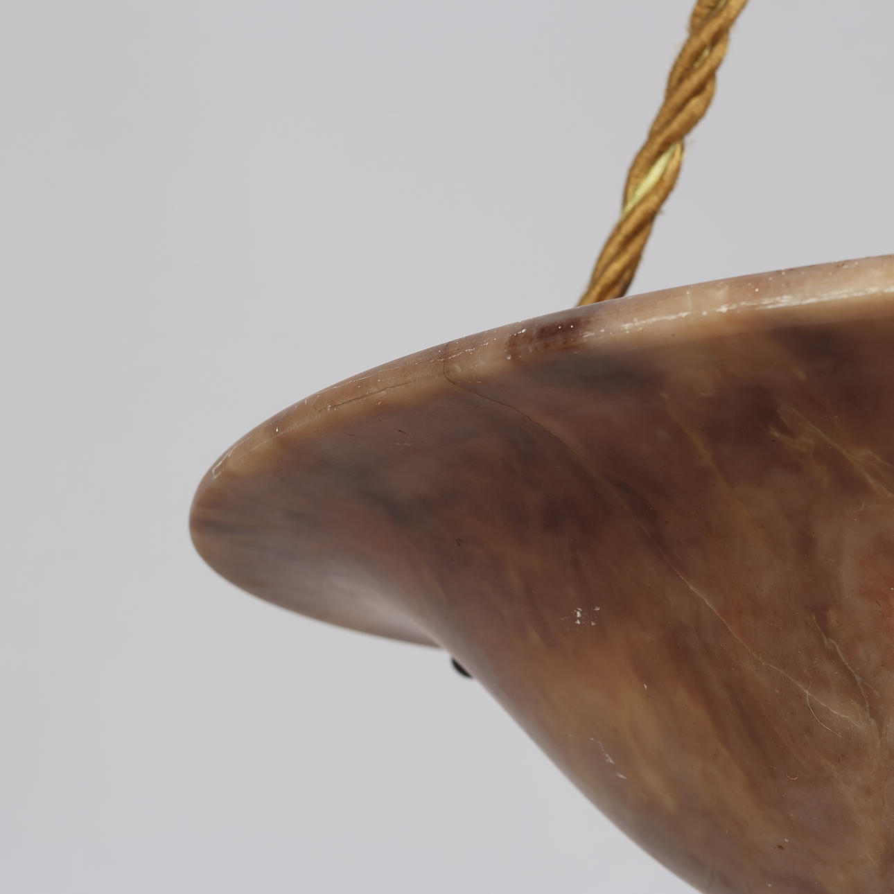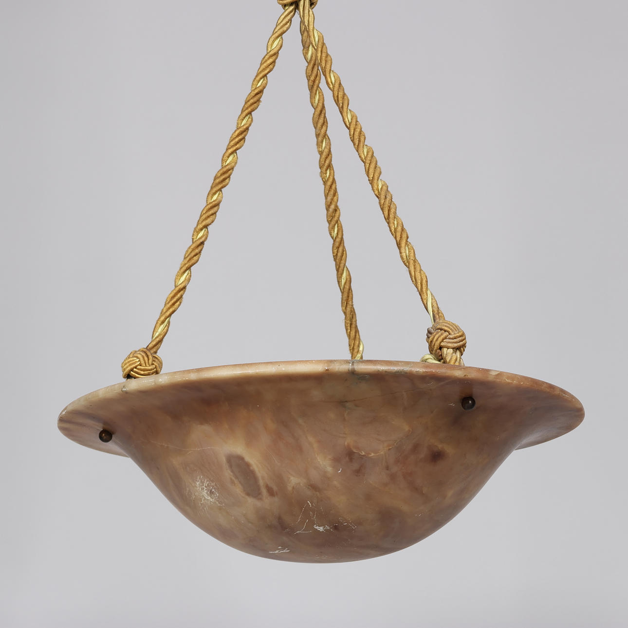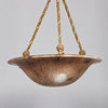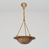 Large ceiling lamp (plafond) of variegated alabaster, intricate suspension and brass details, three light sources.