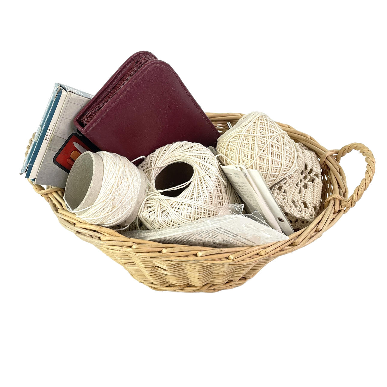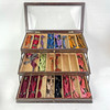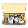 A textile-covered cardboard box with assorted.